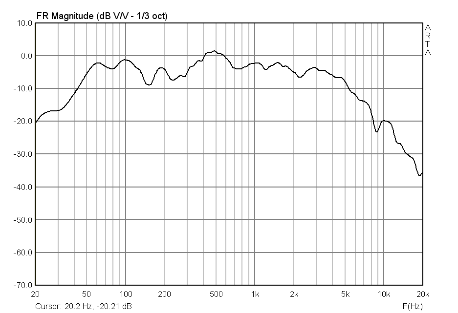 При измерении с 1 см шиш на 3 кГц, думаю из-за очень жесткого и большого колпака, но уже с 30 см в ящике 7 литров