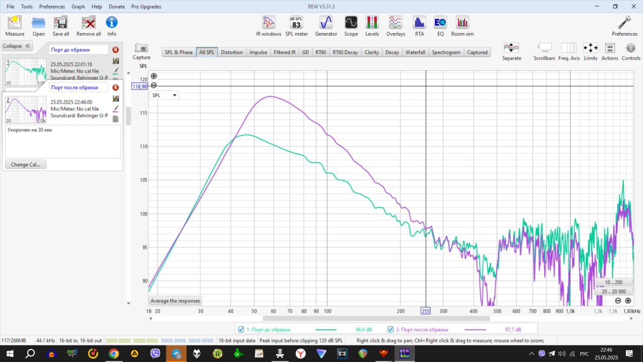 И все в точности насчет диких щелей в стыках и вокруг порта. Замерил исходную АЧХ и импеданс- там дичь невиданная. Когда забрал у внуков весь пластилин, заделал щели- дивная красота в результате.