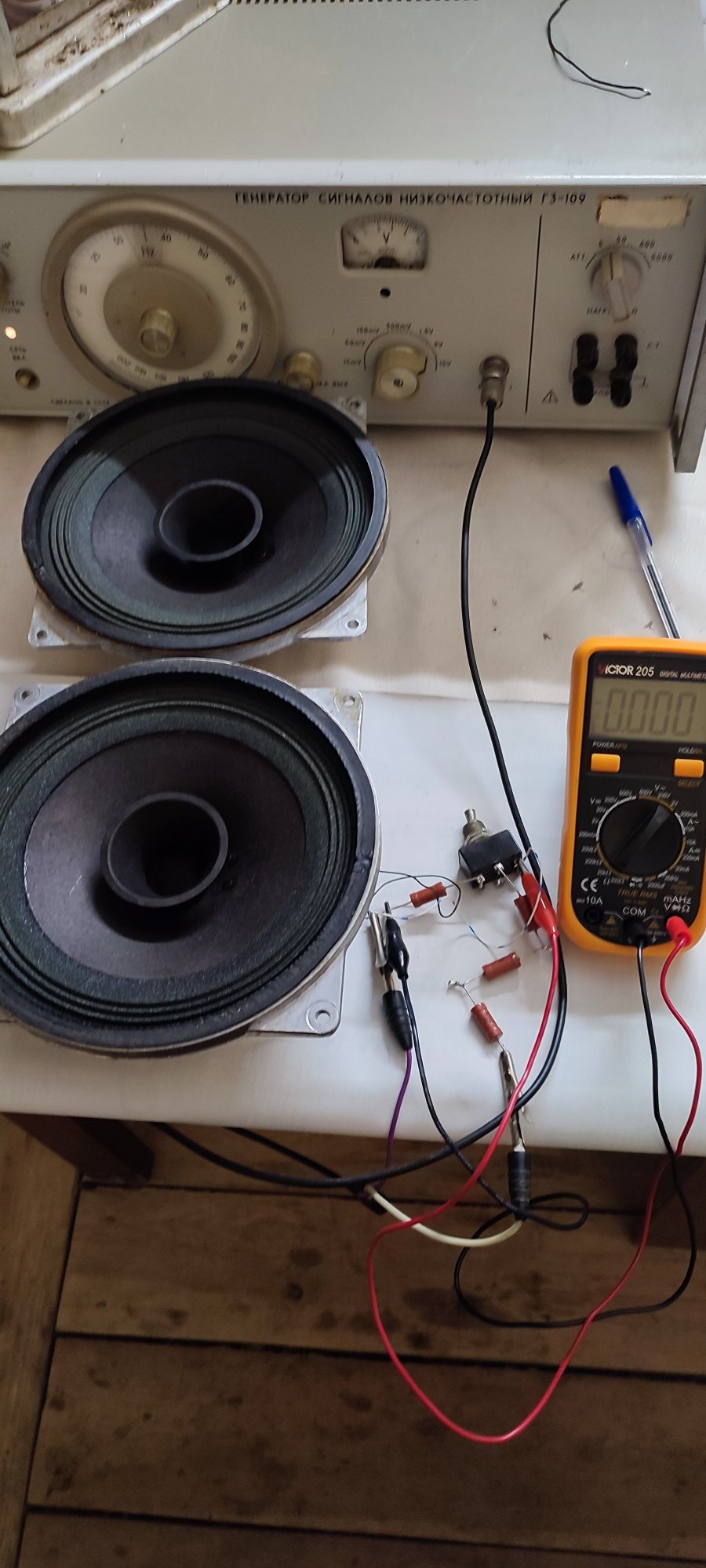 Ящик слава богу широченный, глубокий, 60 литров. За счет этого хватило индуктивности в 2.2 мГн выровнять басовую часть, а емкость 6, 8 мкф параллельно динамику убрала ВЧ мусор и подтянула СЧ участок, подваленный катушкой раньше времени. Стыковали к нему пищалку Сканспик, охрененной ровности и звучности. Звать ее SS D2608 913000. Контур вч получился из емкости на 4 мкф , катушки на 0.47 мГн и гасилки в 1 Ом. И звук охрененный . У кого хватит терпения, пока слазаю в измерком за АЧХ, увидит это чудо.