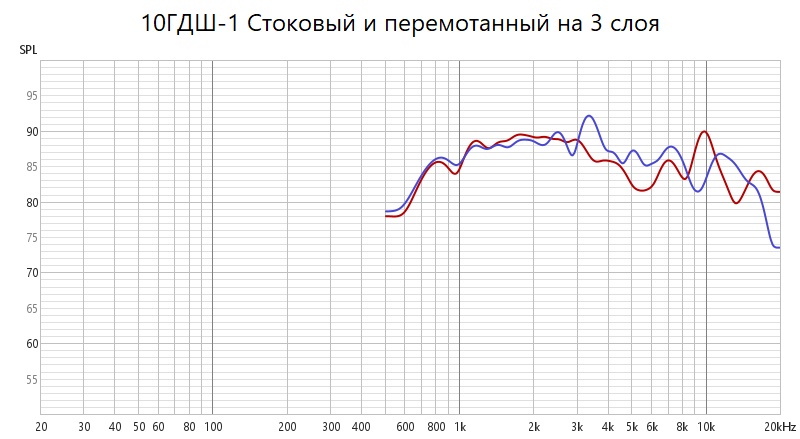 Для наглядности сравнение АЧХ стокового (красный) и перемотанного на 3 слойку (синий)динамиков.