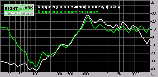 Во 2-м случае кривая тоже должна была просесть на децибел 10, но не делает этого, - моя "эталонная" колонка "не совсем" эталонная. Вот её график с коррекцией тем же сомнительным микрофонным файлом:
