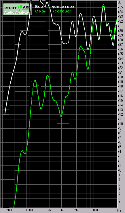 Конденсатор обеспечил полосу работы с 8...9 кГц. При плохом подавлении резонансов ниже 3 кГц.