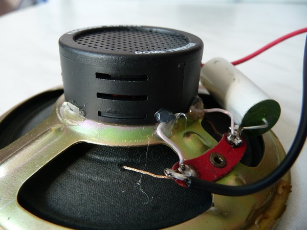Помимо всего, сам куполок излучателя сидит как бы в колодце. Можно разобрав, приклеить излучатель к бумажному диффузору в виде колпака. Например на 4" ШП динамик с наилегчайшей подвижкой у которой ещё и отрезана катушка с ЦШ. Снята МС. Схема подключения любая с трансформатором. Надеюсь будет понятно из фото: