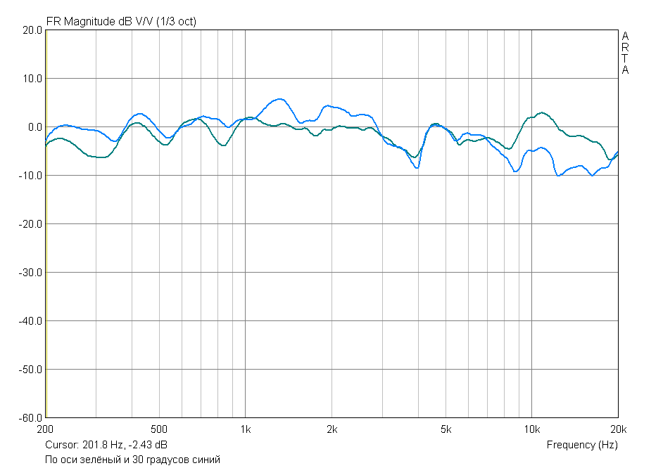 Это с метра по оси, не помню на каком экране. Желтая линия по -3 дБ примерно 15 кГц - отлично, но направленность будет, увы, как у 3ГД-31.
