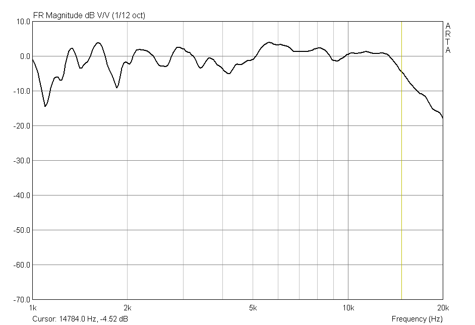 Ниже мой старый замер этого динамика, поскольку здесь я сделал раздел около 2 кГц , то привожу АЧХ динамика от 1 кГц. Поскольку при усреднении 1/3 октавы она выглядит слишком красиво, я намеренно подгадил усреднением 1/12 октавы. Не верю когда слишком ровно.