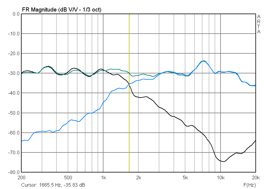 Хорошо видно как ямы и холмы вблизи частоты раздела влияют на суммарную АЧХ, но это влияние небольшое, неглубокая ровная впадинка на 2...3 кГц допустима, я не стал с этим биться.