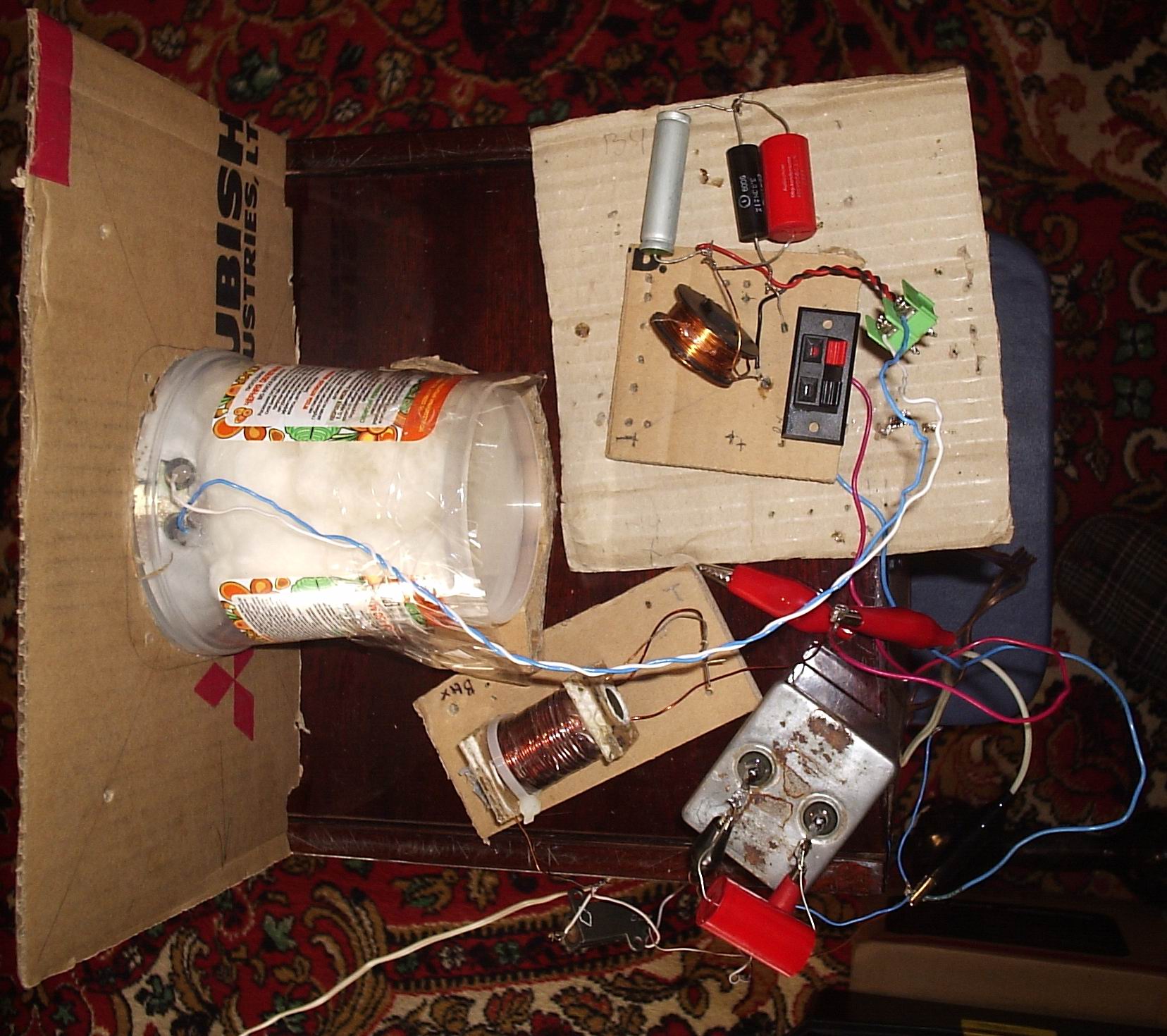 Для испытаний 1ГД-50 я взял подручный пластиковый довольно жесткий стакан 0,5 литра, набил ватой, приклеил термоклеем к динамику, сделал "лицевую панель". Лучше, как у Шорова - жёсткую консервную банку или сделать из фанеры. Объем там не указан, подозреваю 0,8 литра.