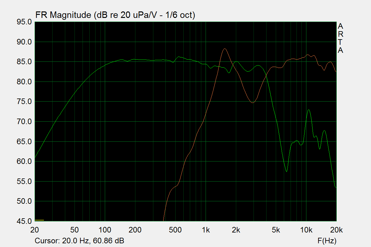 Но даже в таком идеальном виде, эти динамики не годятся для двухполоски с 15ГД-14 - ниже 6 кГц пускать их плохо, а НЧ динамик если доползёт до такой частоты, то будет шататься, как пьяный в САМОЙ ВАЖНОЙ для слуха области частот.