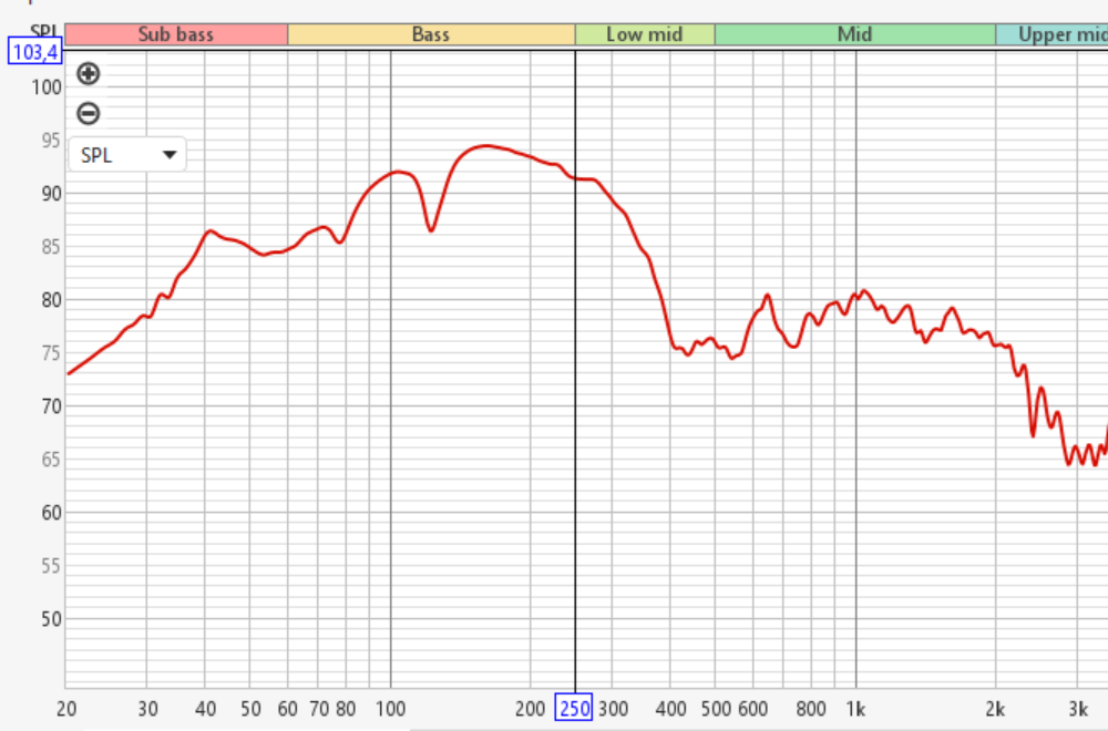 Это хорошая АЧХ для прослушивания лёгкой не насыщенной музыки в которой нет большого упора на суб низ и на большую плотность инструментов в частотке. Проблемы начнутся когда вы захотите выжать из этой красоты НЧ диапазон от 50Гц равный по SPL с СЧ диапазоном. Сразу пропадёт лёгкость и красота звука у такого динамика. Но проблема в целом ещё глубже чем кажется на первый взгляд.... Я ещё не слышал ни одного ширика который мог бы достойно воспроизвести НЧ диапазон хотя бы от 60Гц, и при этом не иметь явных слышимых проблем в диапазоне 1кГц-10кГц....