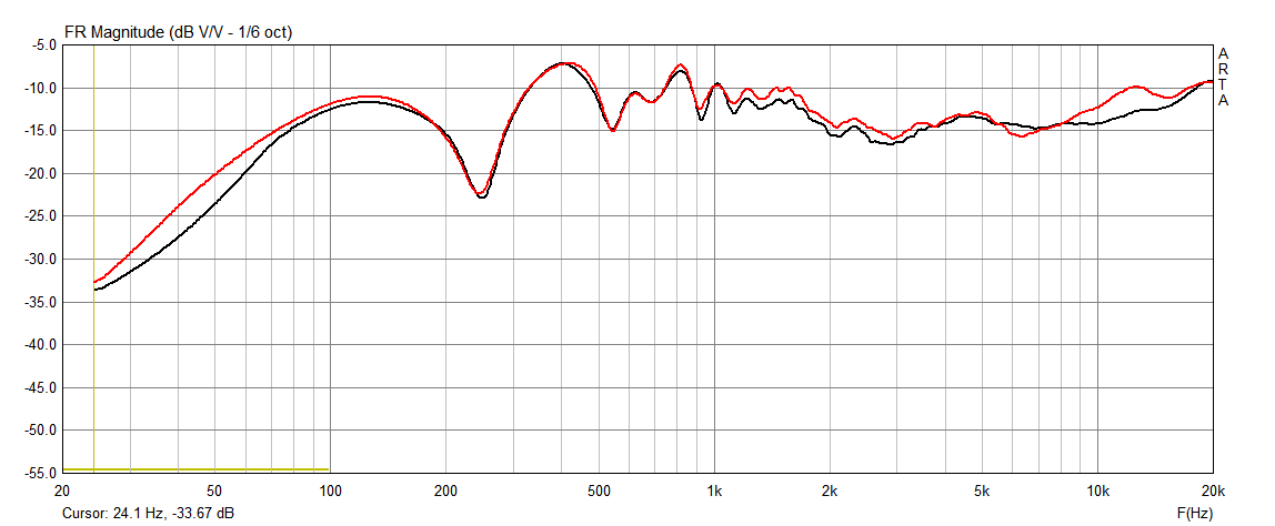 Прикрепил фетр - ничего не изменилось, ну может на 0,5 дБ в некоторых местах. Затем прикрепил ватин пресованный, 4 мм. Вот что имею, вариант 5. Красная с кольцом из ватина, синяя - без:
