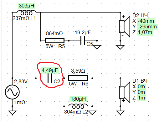 Что такое НЧ фильтр для мида из катушки 0,3мГн - это меньше чем ничего. Динамик как выл и орал на средине, так и будео орать и выть, а вы будете забавляться картинками , вместо того. чтобы дать шум, музыку, послушать , усомниться в выданной вам схеме и на ходу добавить-убавить деталек и выправить нужное звучание.