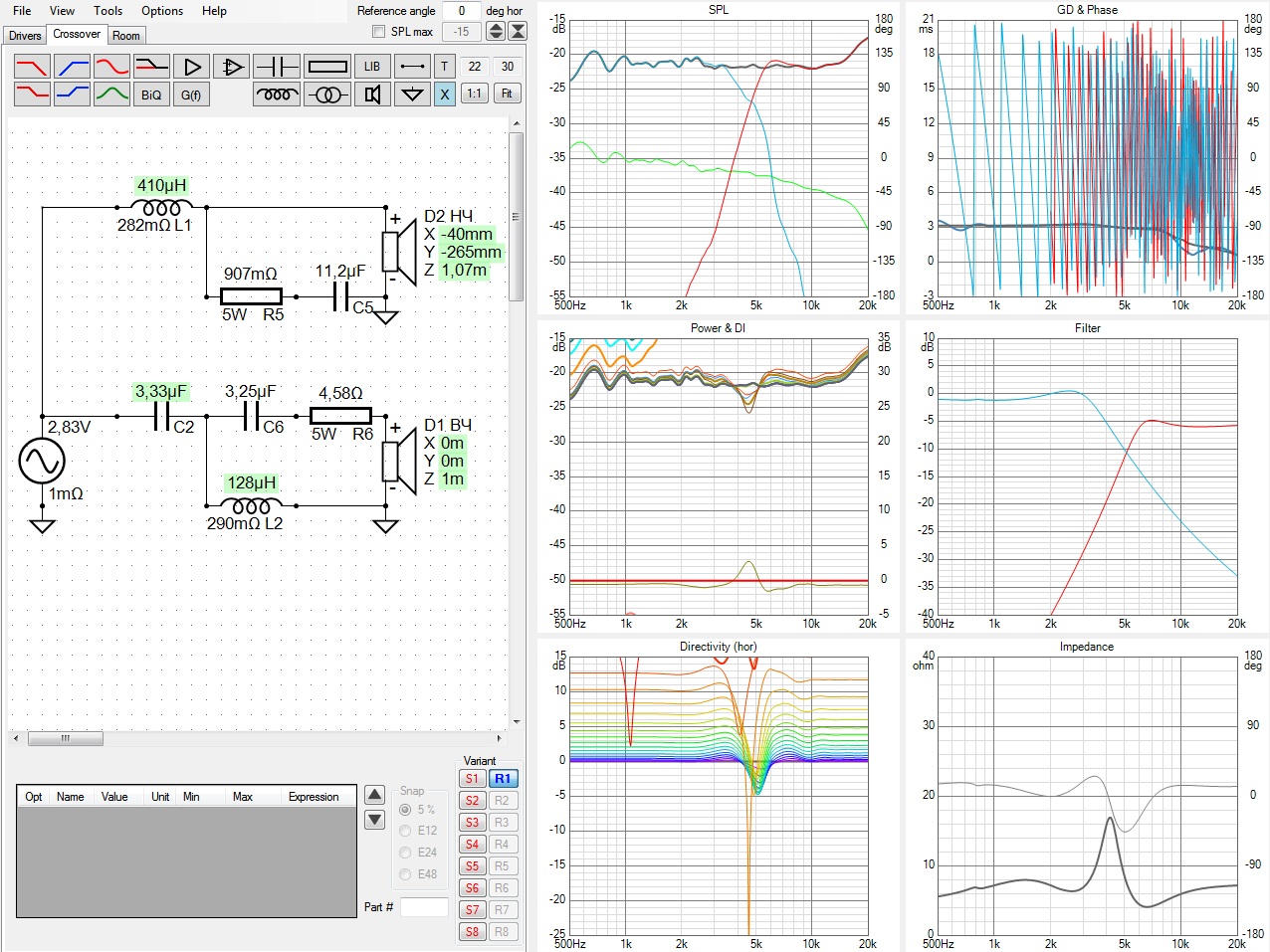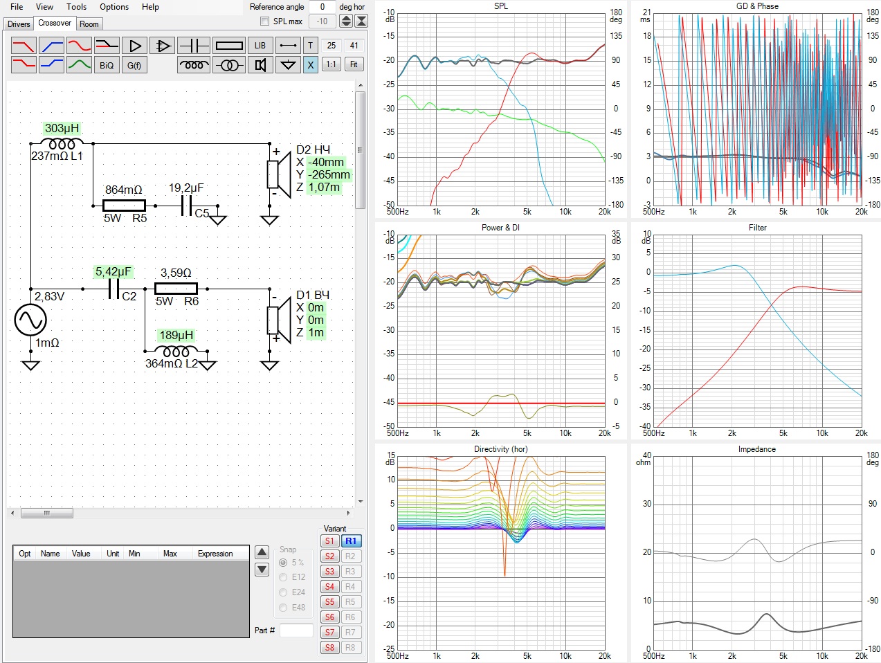 А пока набросал 8 вариант с 2 порядком на ВЧ, но снова АЧХ уже и НЧ и ВЧ динамиков выше общей АЧХ, но какой ровный импеданс. Кстати импеданс не зависит от расположения динамиков, так что можно ему верить.