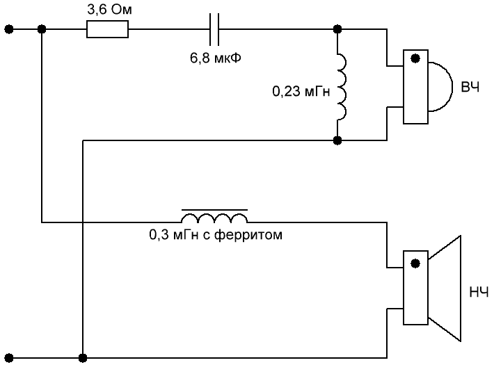 Резистор 3, 6 Ома на входе вч фильтра виртуально добавит вам емкости к 6, 8 мкф, и без того конской, а индуктивность 0,23мГн рухнет вдвое. АЧХ получится собачая.