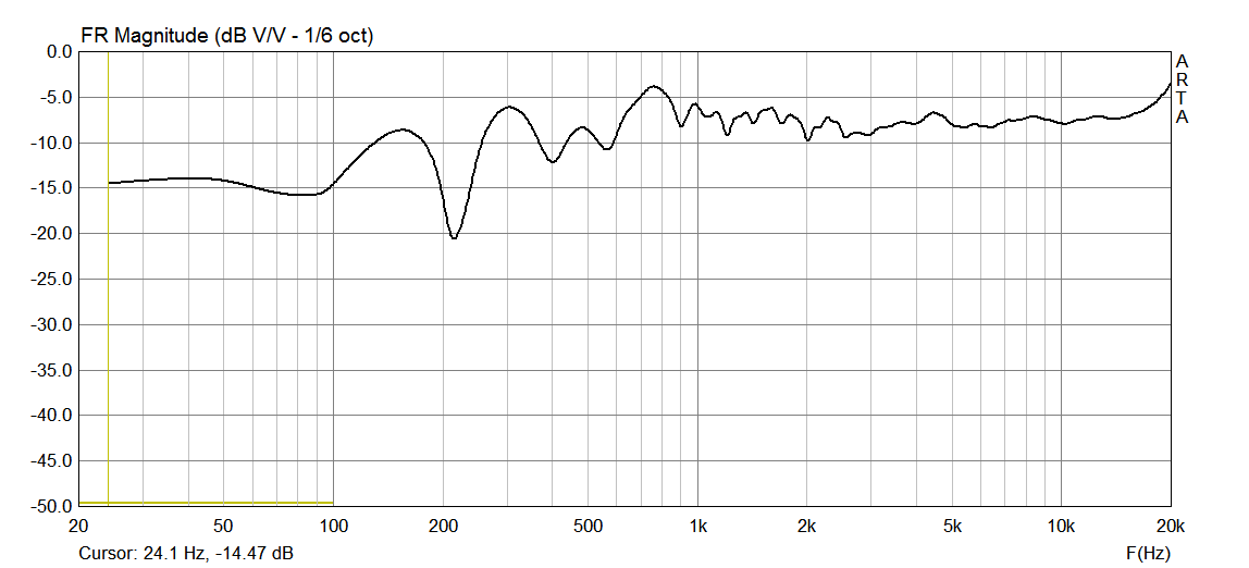 Второй заход на акустическую гасилку. Ваша неудача с шайбой показала непригодность материала. Я испытывал войлок от шумоизоляции авто толщиной 8 мм, без слоя самоклейки. Так подносишь его к уху и ощущаешь одностороннюю глухоту по ВЧ, сразу. Шайба из такого войлока перед 20ГДС-1 (при держании пинцетом, пальцы создают резонансные призвуки) на розовом шуме чётко даёт пропадание пика 4,5кГц, но также валит и 3 кГц, то есть, валит всё, что излучает куполок, с увеличением завала с ростом частоты. Направленность динамика при этом чётко уменьшилась. Видимо, у ватина крупные волокна, он на ПАС пойдёт. А фетр слишком тонкий. Может, попробуйте ишшо раз с материалом, действие которого будет чётко заметно на слух про размещении его перед куполом НЧ, если НЧ включить без фильтра. Ещё мысля. Измеряете по оси ВЧ, а из-под шайбы выглядывает в сторону микрофона край кумпола=>шайбу надо слегка большего, чем купол, диаметра.