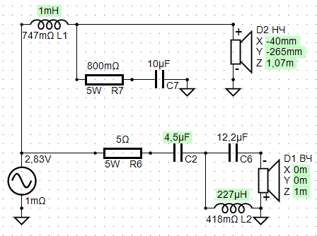 По схеме от Троелса. Дело в том, что 2 порядок для ВЧ динамика с низким разделом звучит плохо, 3 намного лучше. Не забывайте сопротивление у ВЧ 3,5 Ома.резистор в вч контуре добавит вам емкости к вашему С2, убавив индуктивности катушке 418 мкгн, плюс третий собачий порядок фильтра( что вы все так его обожаете) . Крутим кино назад.