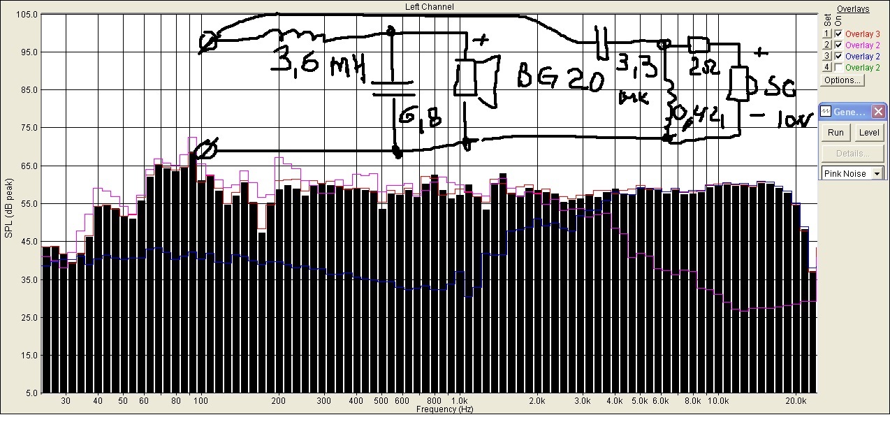 Это я и думал. Тогда давайте обнулим измерения с такой высокой частотой раздела. Розовый шум что присылал схема сохранена, но разобрана, там 4,5 кГц стык.Высокая частота стыка проваливает средину , если пищалка выше уровня слуха, мид суживается отдачей на этих частотах, а пищалка слишком далеко работает. не перекрывает своим излучением зону излучения мида.