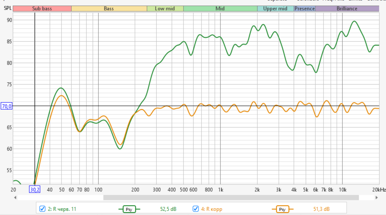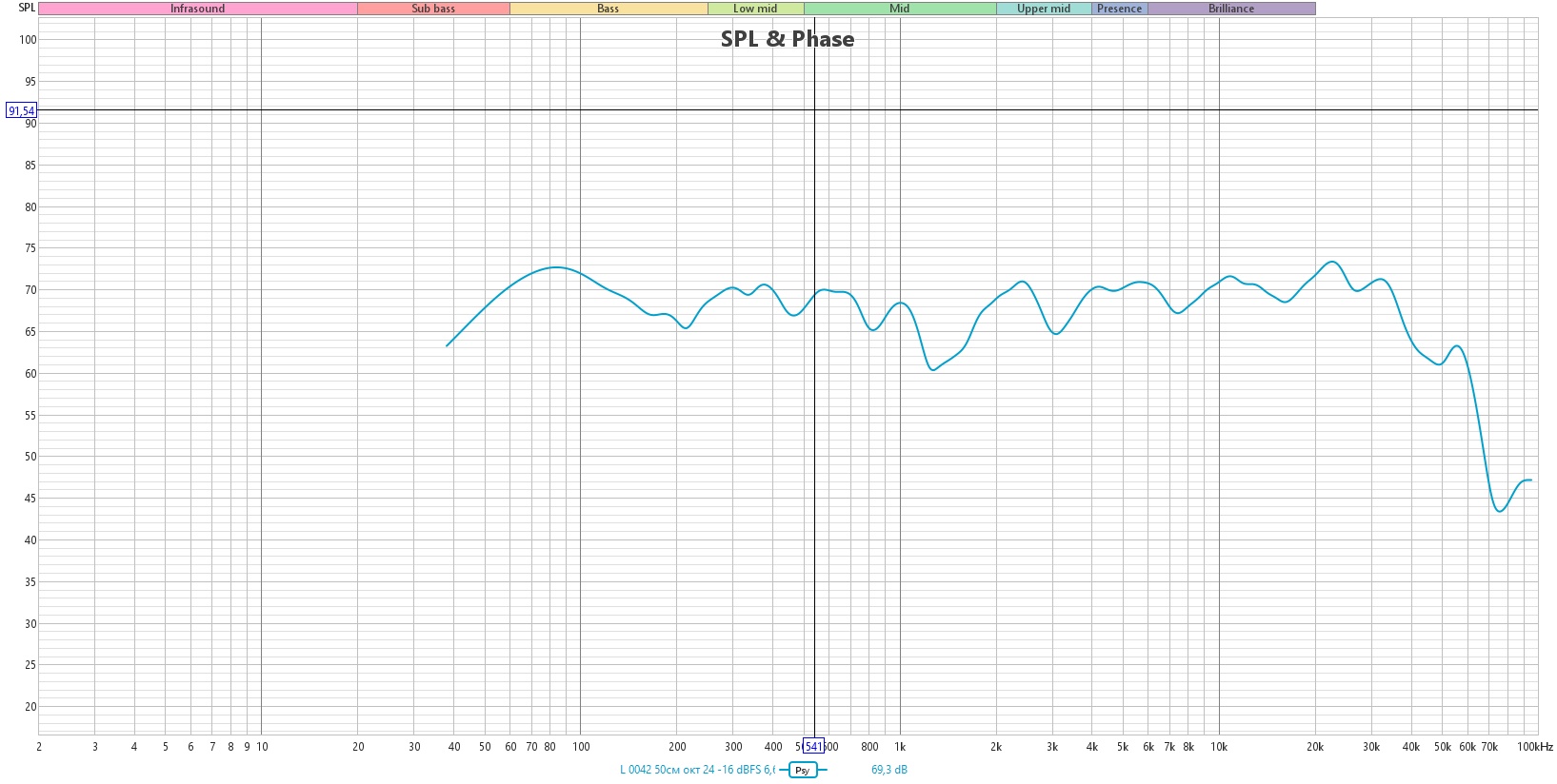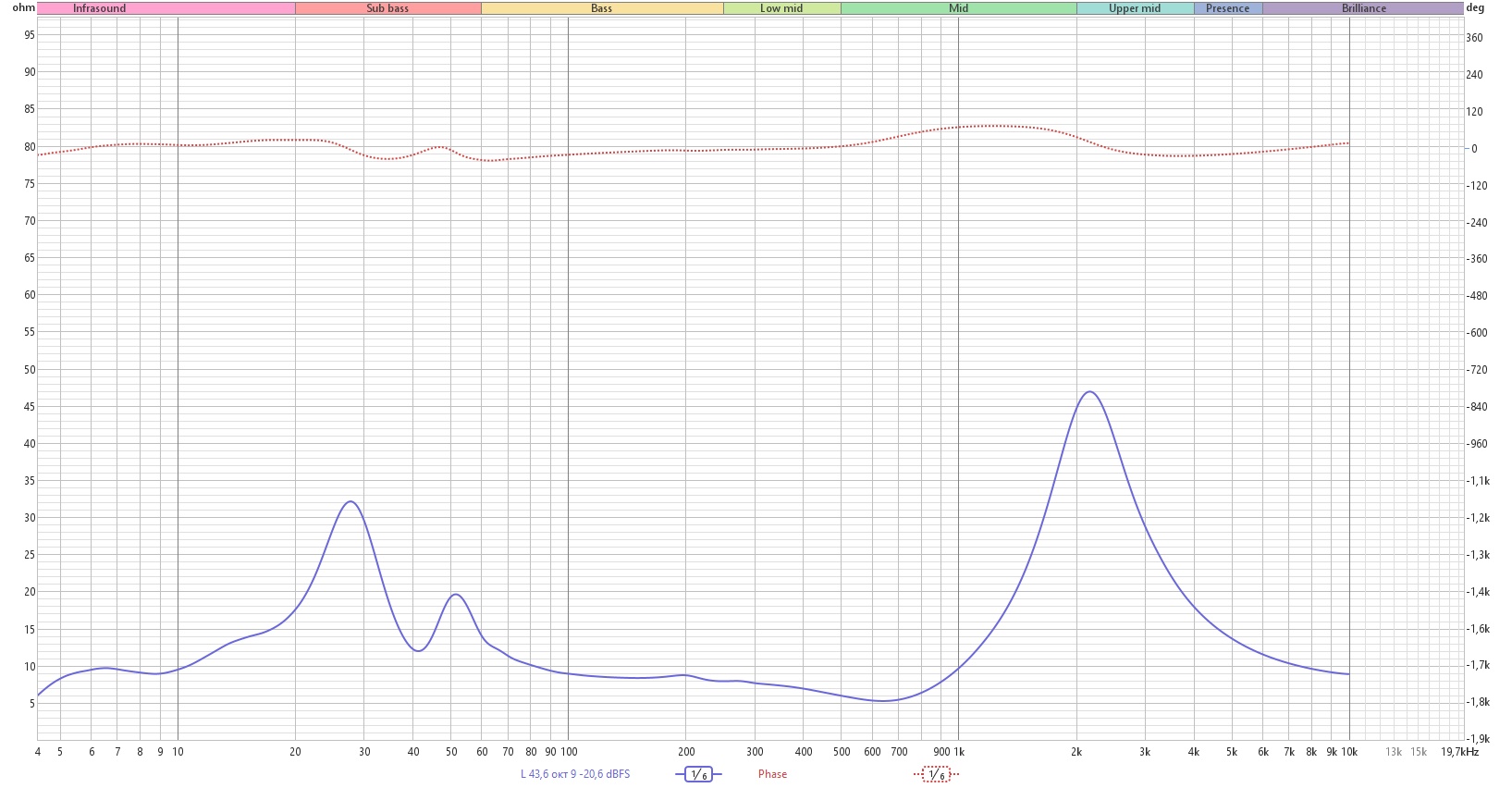 Исходя из импеданса, частота настройки ПИ около 41-43Гц, эффективность высокая. Отсюда ПИ будет горбить начиная с 40 Гц до 60-70Гц до +6 Дб, возможно даже чуть больше. В принципе это то, что нам и нужно, ибо "ухам" в той части диапазона не хватает давления, при комфортном уровне прослушивания.