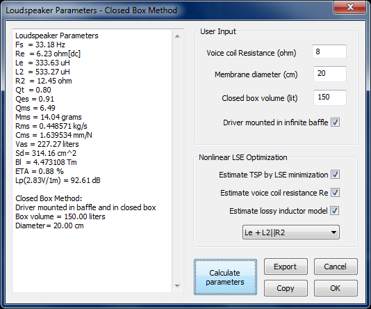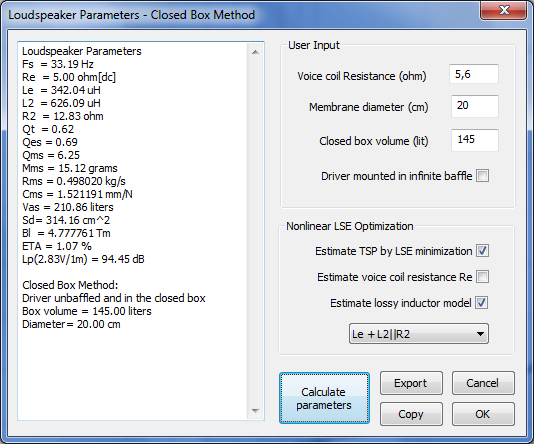 5. В открывшем окне не забываем указать параметры динамика и объём ящика. Вуаля перед вами характеристики вашего динамика.