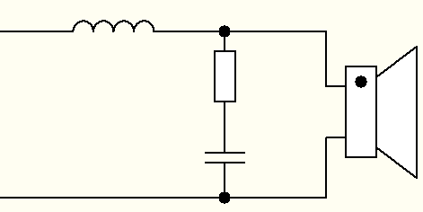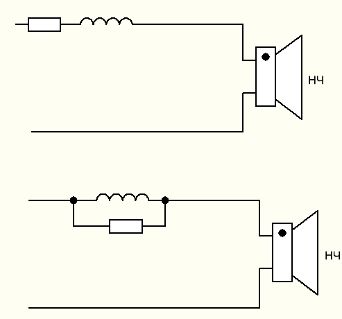 LR цепочка всегда параллельная и ставится последовательно с динамиком, это позволяет сгладить "ступеньку" которая часто бывает у ШП динамиков.