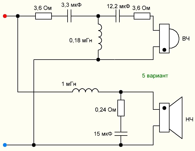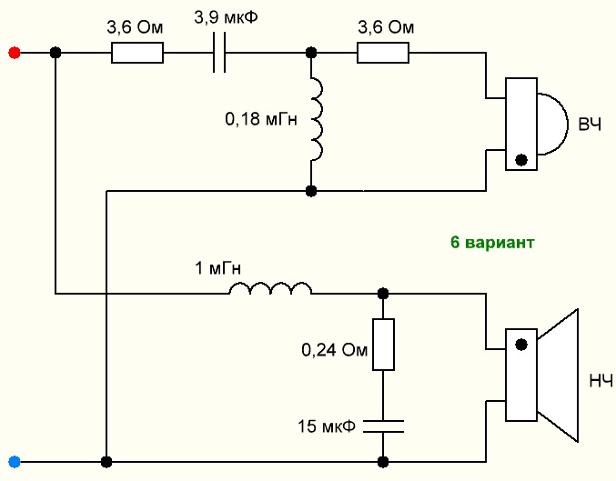 Вариант 6 не лучше. Уровень ВЧ не подняли, он будет влиять на стык. Ещё попробуйте 5 или 6 с резистором 2 Ома последовательно с 15 мкФ, может лучше состыковаться с ВЧ, ближе к варианту 2.