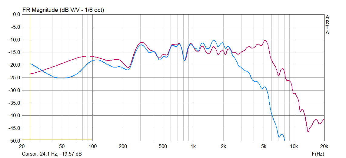 Прикрепил фетр - ничего не изменилось, ну может на 0,5 дБ в некоторых местах. Затем прикрепил ватин пресованный, 4 мм. Вот что имею, вариант 5. Красная с кольцом из ватина, синяя - без: