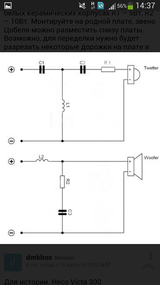 Да, у ВЧ горб на 5 кГц. А у НЧ - резкий пик, и в противофазе. И если Вы дадите им обеим работать на 5 кГц, добившись ровной АЧХ, скажем, по оси ВЧ, то выше по углу, в сторону ВЧ, будет пик от ВЧ головы, а по оси НЧ будет провал от более сильного противофазного влияния НЧ, а по комнате - отражения от ВЧ пика в полной красе. В Вашем случае придется мириться с плавным горбом ВЧ в пользу слитного.и непрыгающего по фазе и амплитуде звучания, имхо. Хотя... Можно попробовать второй на ВЧ с горбом на 3 кГц, подтянув вверх левый скат горба АЧХ ВЧ динамика, просадив всю область ВЧ на пару дБ. Тогда раздел будет ниже 2 кГц, ВЧ должен потянуть. Соответственно, НЧ начать валить ещё раньше, катушка больше 1 мГн, от НЧ - никаких артефактов на ВЧ.