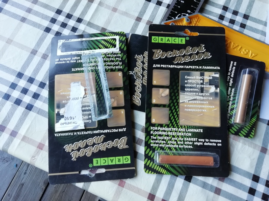 Это специальный восковой, тонированный карандаш. Пластилином я его конечно зря назвал. Им достаточно удобно заделывать мелкие сколы, трещинки, царапины, ямки на шпоне. Только нужно выбирать его чуть темней обрабатываемого покрытия. Шпон, ламинат, фанера. Именно этому воску был нужен фен (обычный, бытовой, еле дышащий), потому как воск не особо и разминался пальцами. Хотя именно такой процесс и описывался как способ нанесения. Нагревал феном место дефекта. В зону обогрева попадал и карандаш. Внедрение воска в поверхность дефекта отличное. дня через два, снял излишки металлическим шпателем. При обработке шлифмашинкой ни на диске, ни на ленте его следов не обнаружил. И собственно как-то даже забыл о нём когда корпуса покрывал лаком. Значит не было заметно, да и лак на него лёг без изъяна. Надо будет разглядеть пристальней когда привезу корпуса домой для сборки АС.