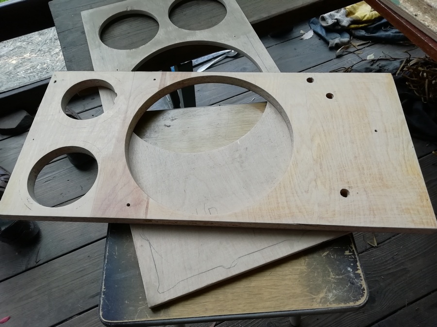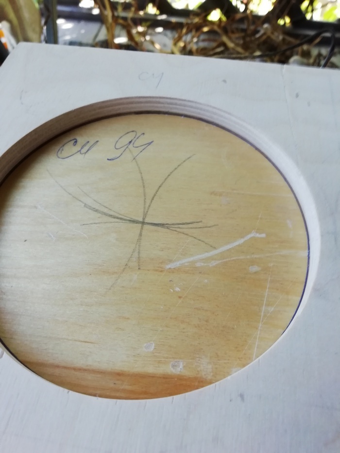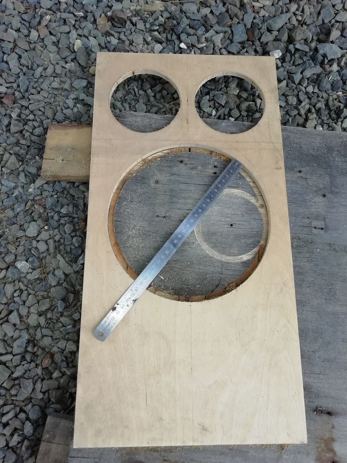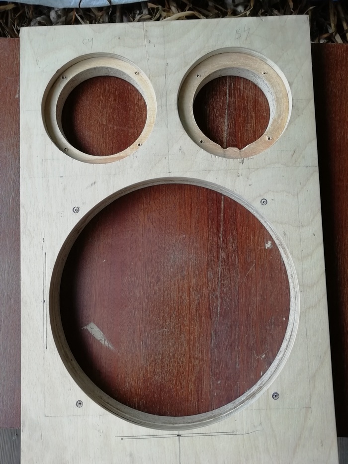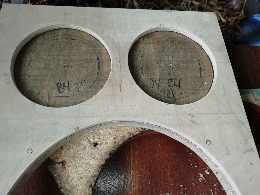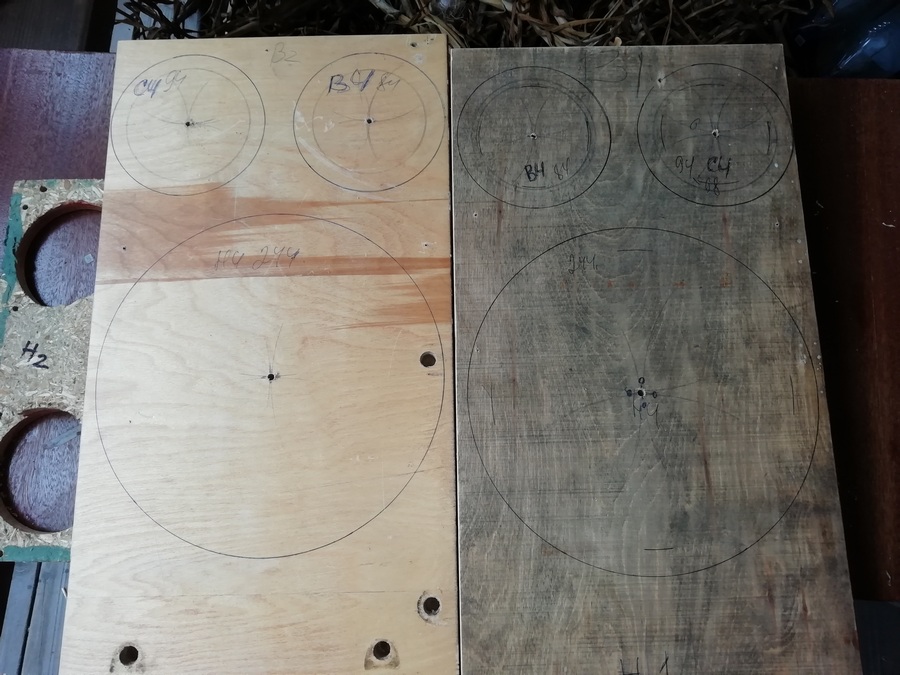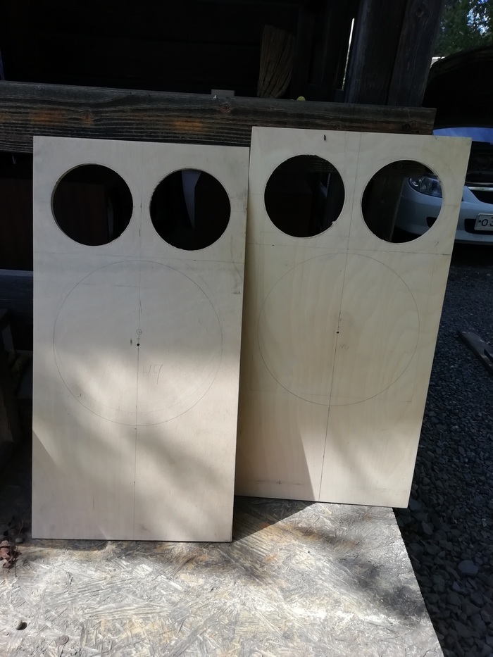 Так как наружный диаметр фланца пищалок от Ямахи имеют размер 115 мм, а такой же диаметр СЧ головок 116,0 мм То и разметка Будущих отверстий под фланцы выбрана одинаковой и равной диаметру в 117 мм. Так как все отверстия сквозные и без полок, то фланцы ВЧ/СЧ буду опираться на внутреннюю (вторую, приклеенную) часть фронтальной панели толщиной 18,0 мм. Диаметр отверстия под магнит ВЧ = 82,0...84,0 мм. Под СЧ = 94,0 мм. Крепление скорей всего будет на шипастых гайках и болтах под шестигранник.
