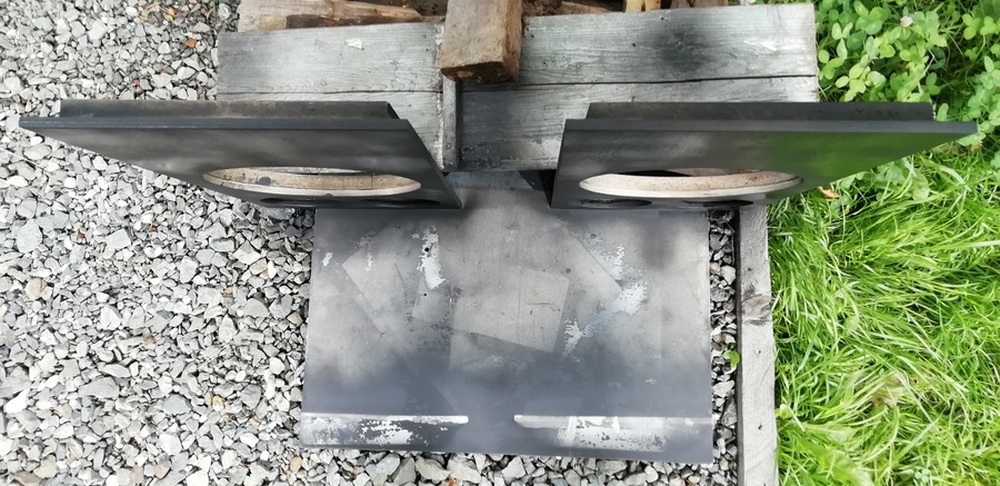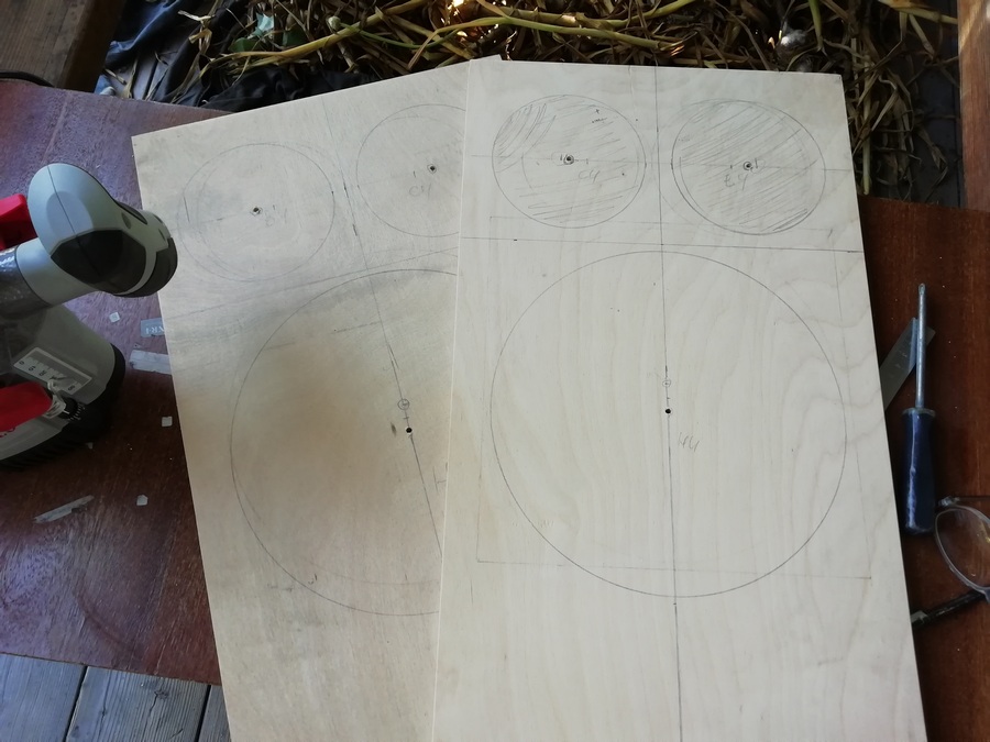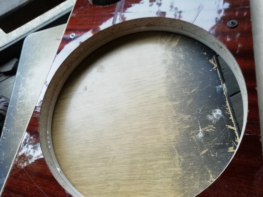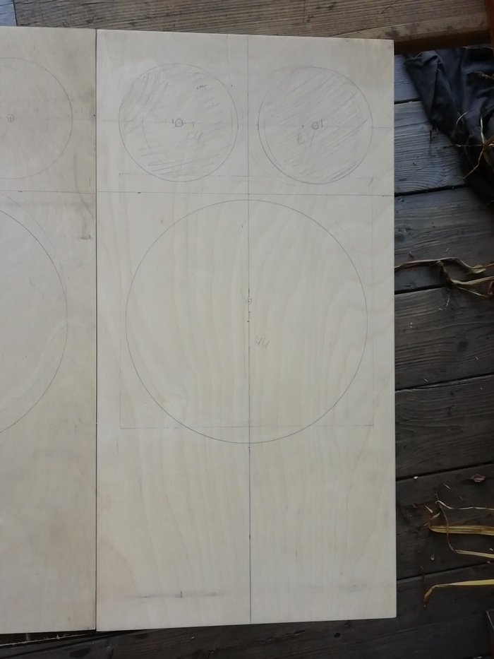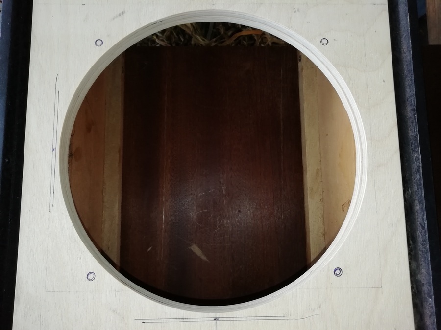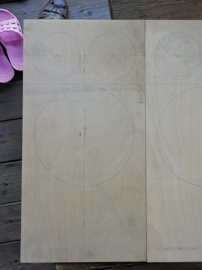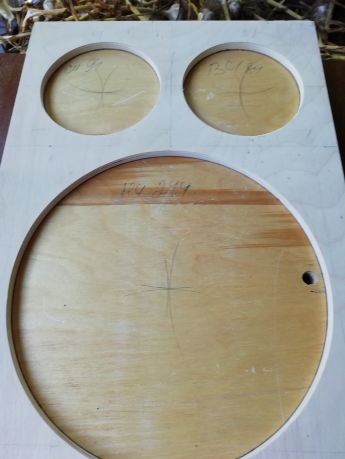 Так как наружный диаметр фланца пищалок от Ямахи имеют размер 115 мм, а такой же диаметр СЧ головок 116,0 мм То и разметка Будущих отверстий под фланцы выбрана одинаковой и равной диаметру в 117 мм. Так как все отверстия сквозные и без полок, то фланцы ВЧ/СЧ буду опираться на внутреннюю (вторую, приклеенную) часть фронтальной панели толщиной 18,0 мм. Диаметр отверстия под магнит ВЧ = 82,0...84,0 мм. Под СЧ = 94,0 мм. Крепление скорей всего будет на шипастых гайках и болтах под шестигранник.