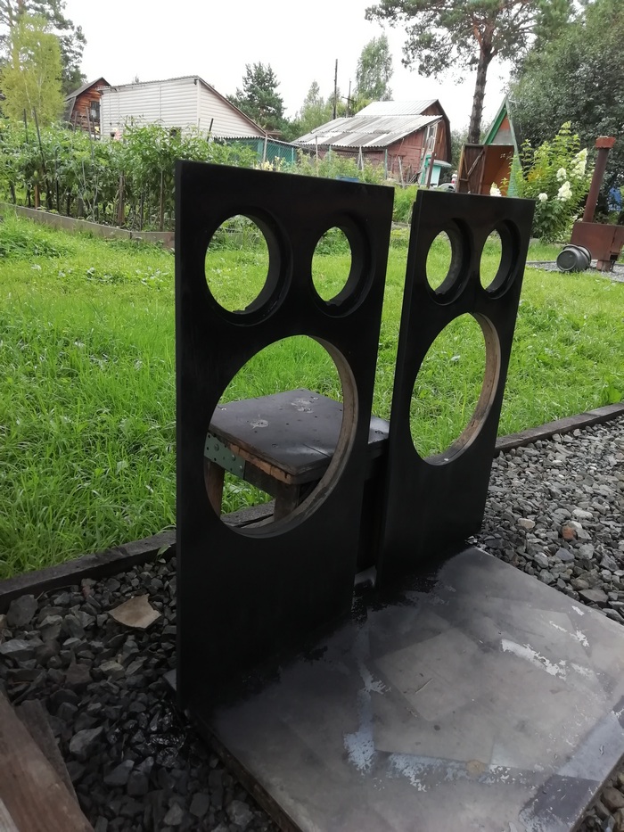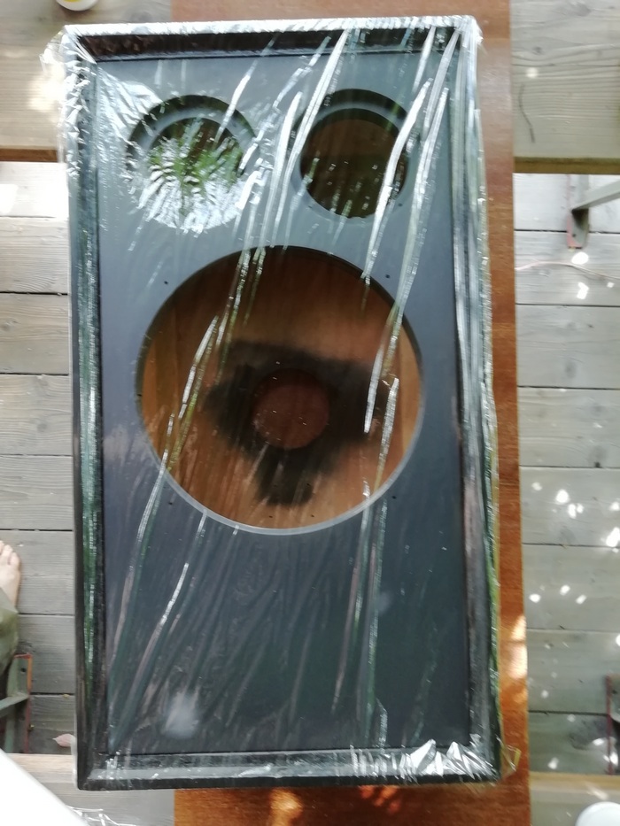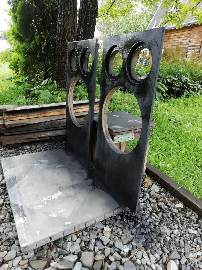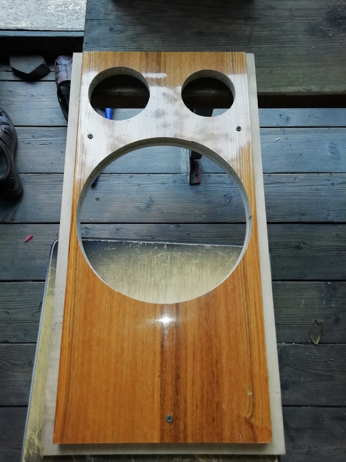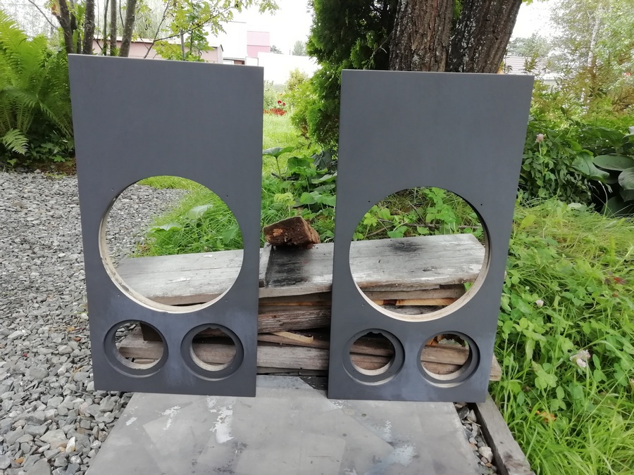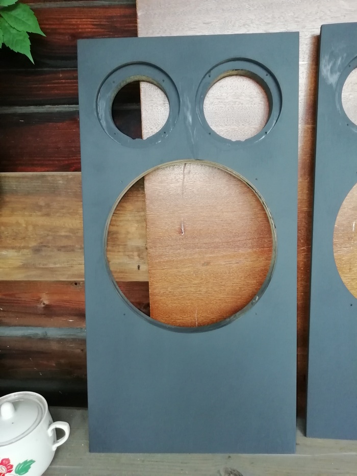 Затем из пары подходящих кусков мебельной ДСП вырезал внутреннюю часть фронтальной панели, которая встаёт между упорных реек корпуса АС. Внешне и внутренне - аналог стоковой # 245, стр. 9 этой темы, только с другими динамиками.