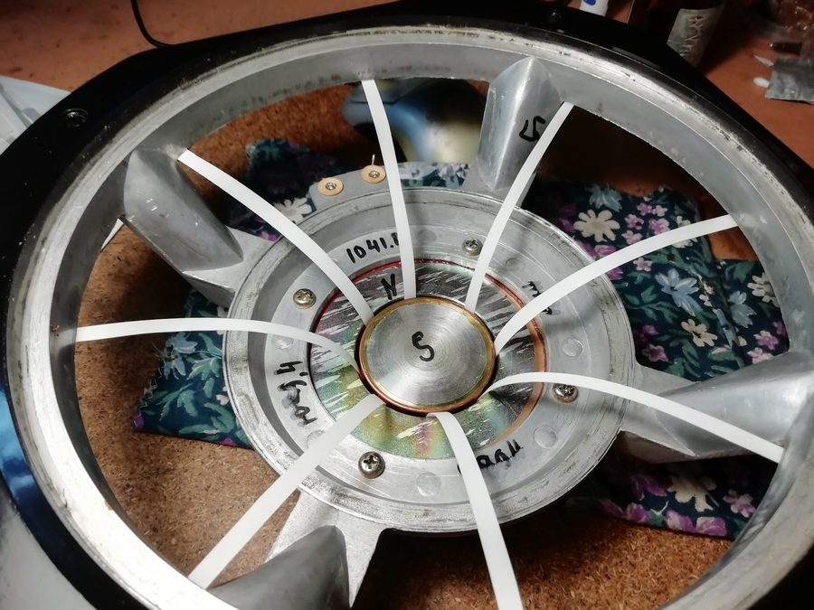 Центровка катушки с наружной её стороны. Ленточки использовал пластиковые толщиной 0,31 мм. Люфта катушки в зазоре ноль. Ленточки доставались из зазора легко и непринуждённо.