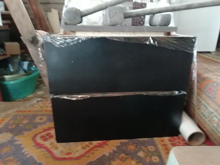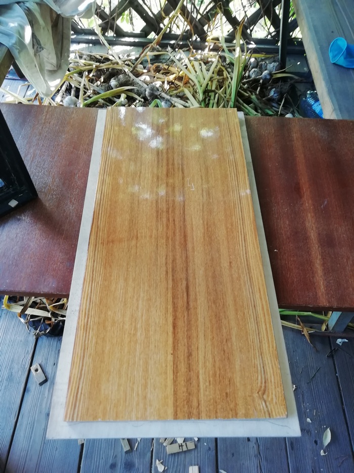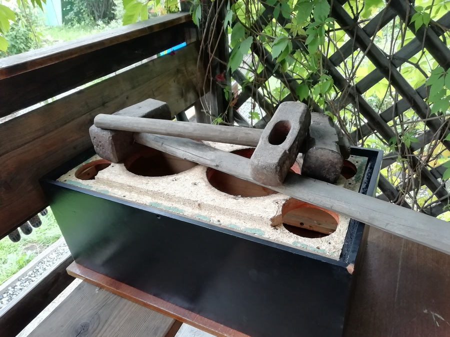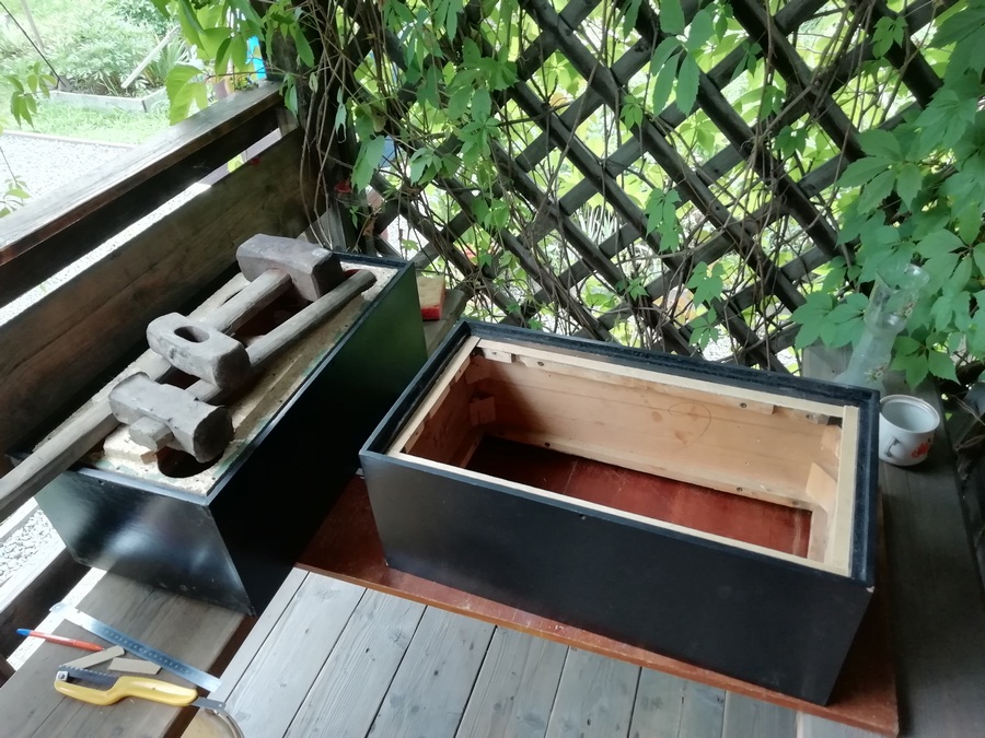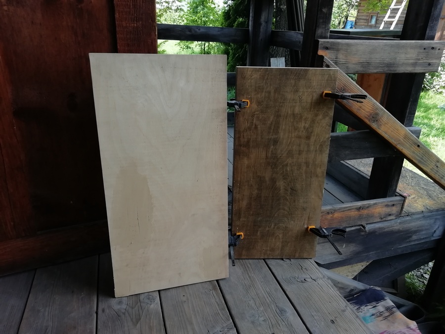 Точно так же поступил со вторым корпусом, который в готовом виде (со свежевклееной панелью) установил сверху первого. И уже сверху пары положил тяжеленный колосник из двадцатки (который мне вырезали как запасной к новой банной печке) и три кувалды одна другой тяжелее.