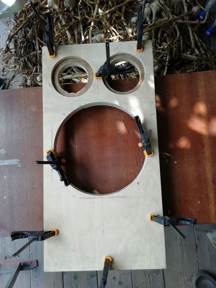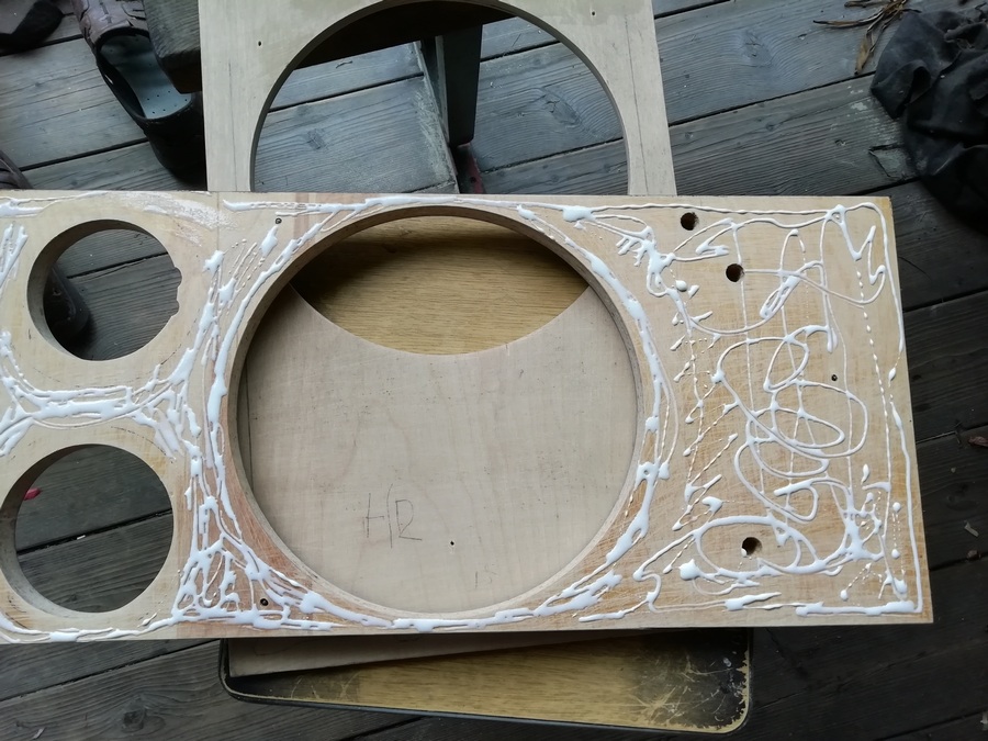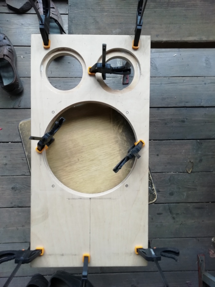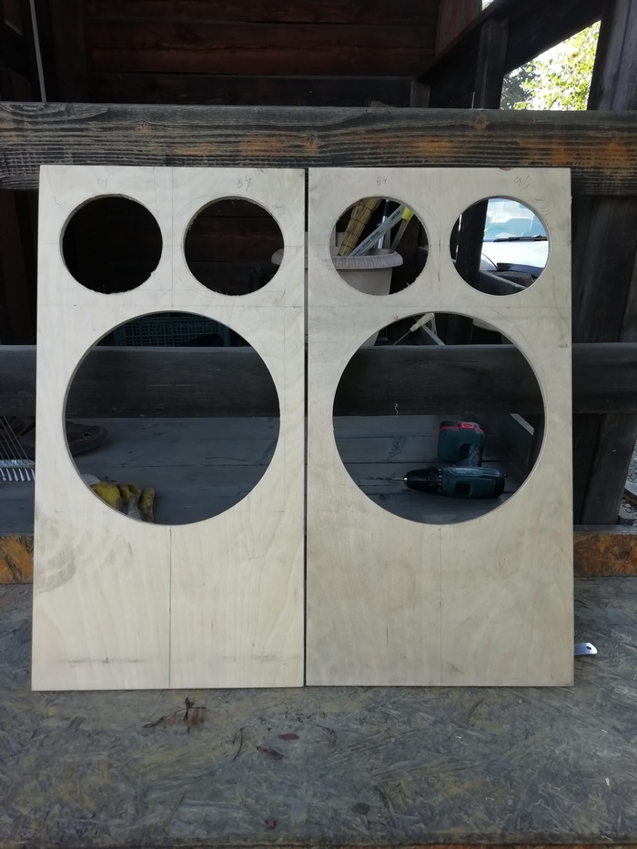 Центр НЧ динамика расположен на высоте 310,0 мм от нижнего края наружной панели. Вероятно завтра, постараюсь отверстия вырезать (фрезер привез на дачу) и приклеить панели друг к другу.
