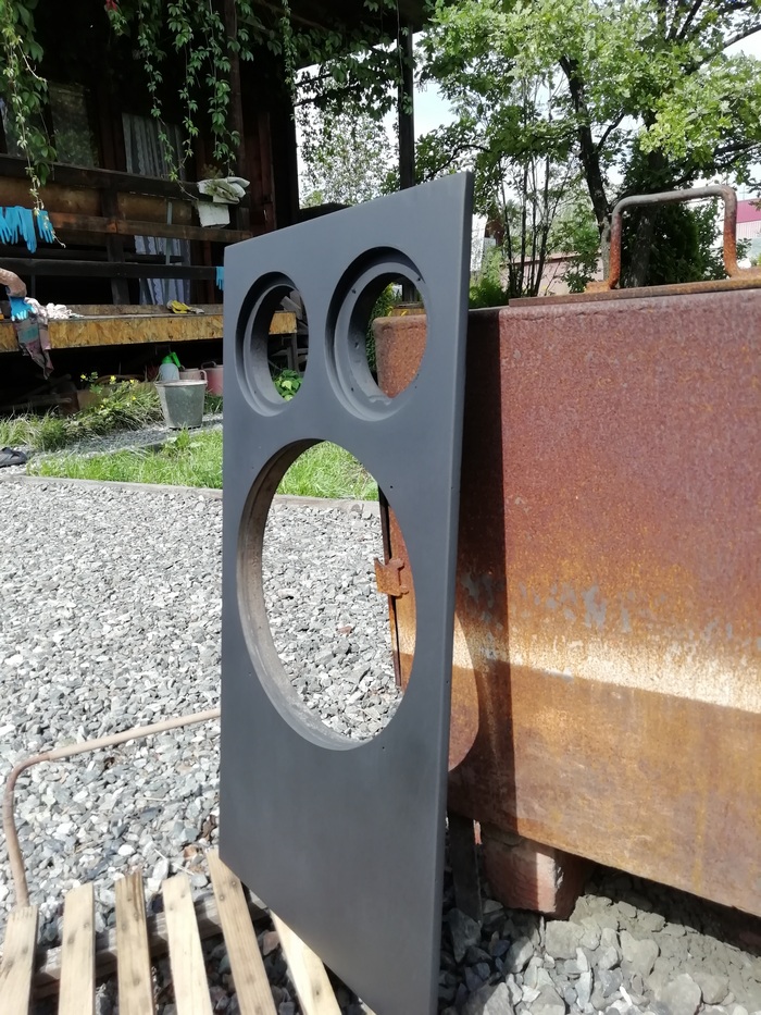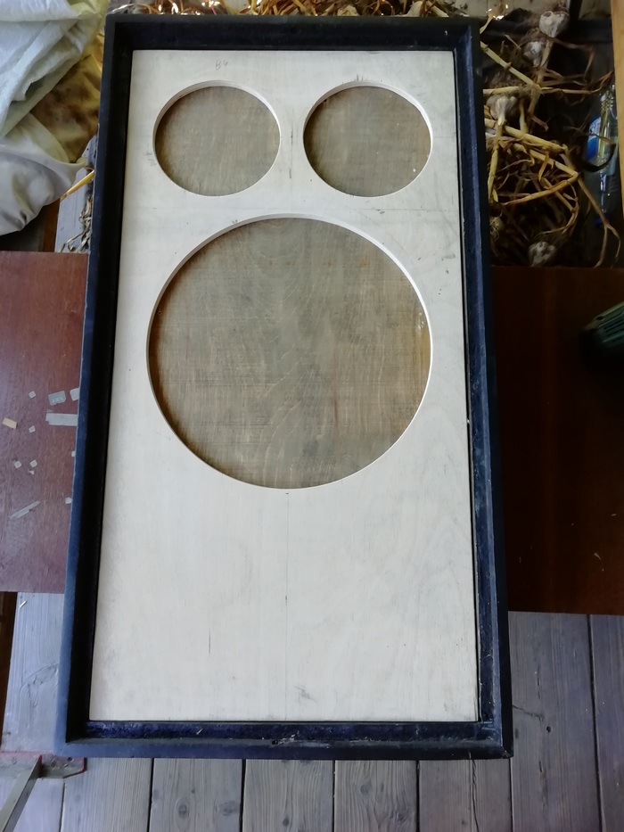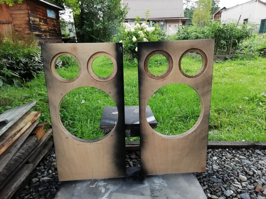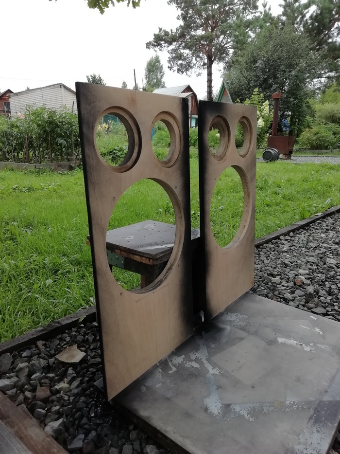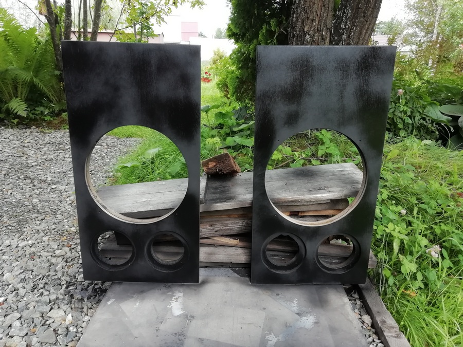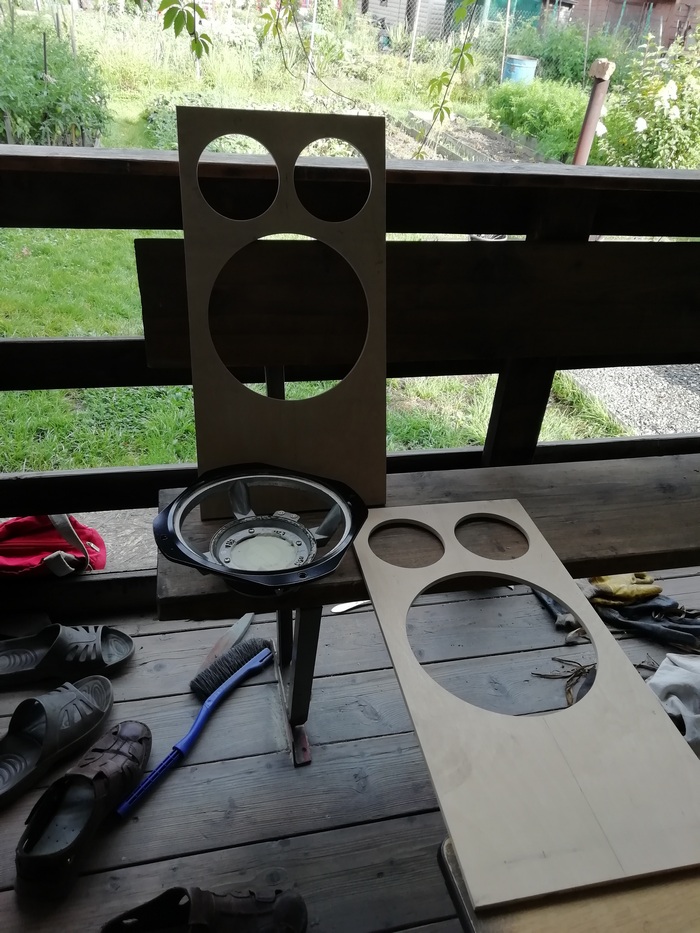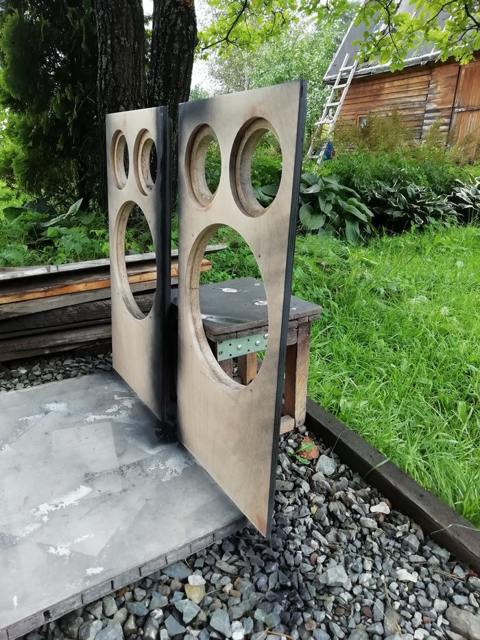 Из простой фанеры, надо сказать, что довольно качественной, вырезал прямоугольники встающие во второе углубление корпуса АС. В первое встаёт гриль-сетка.