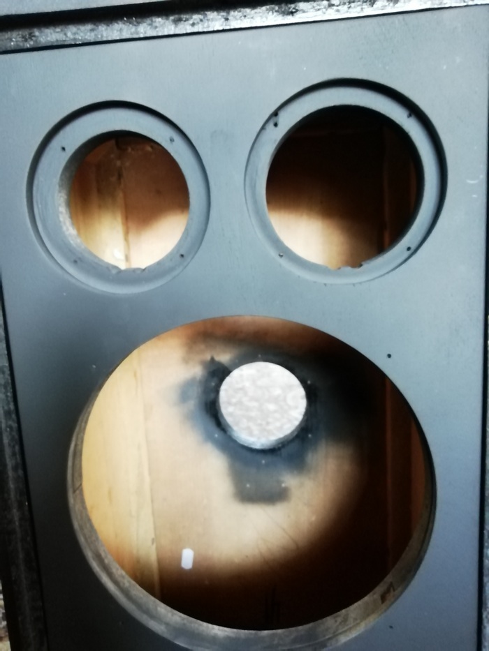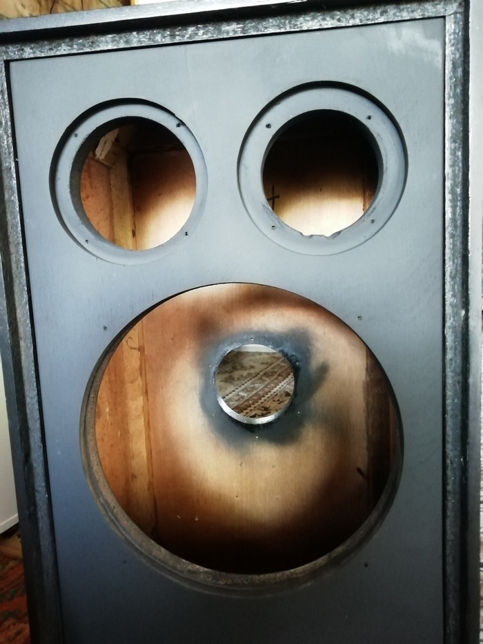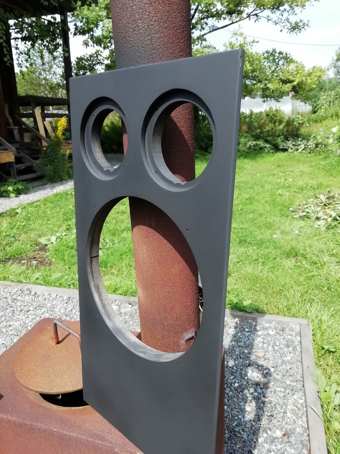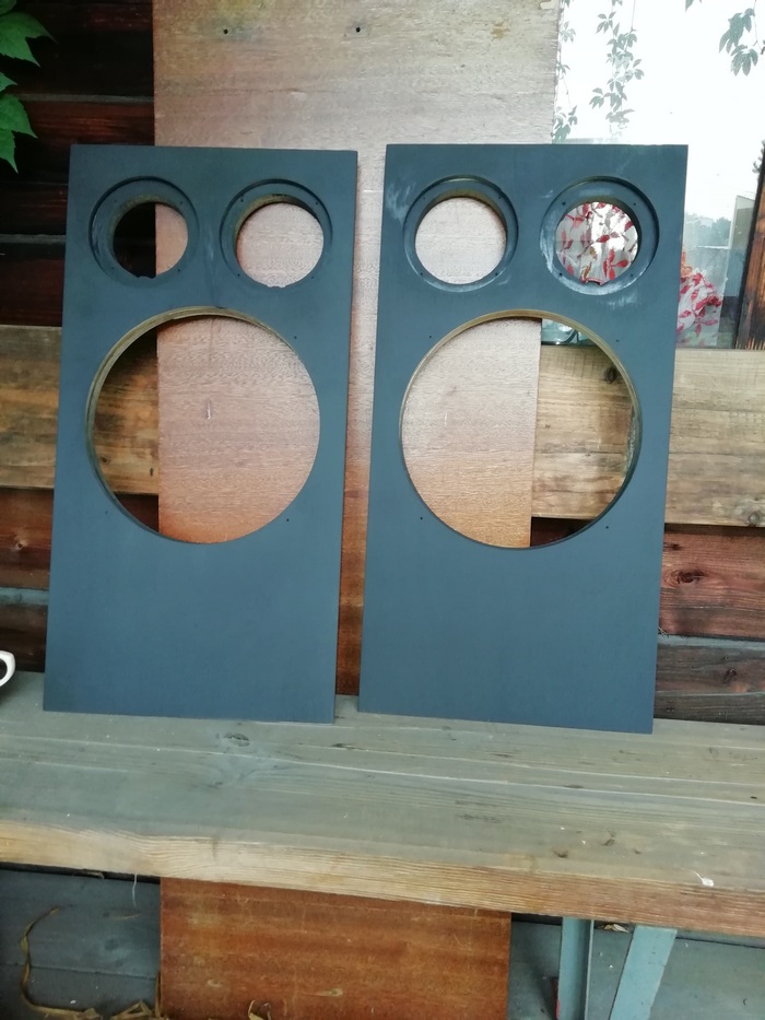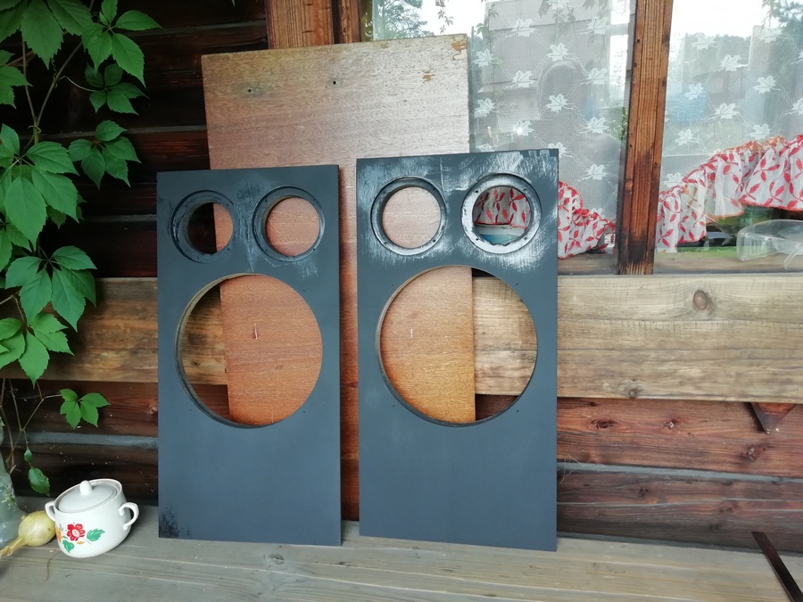 Слегка переборщил в верхней части панелей. Это когда закрашивал внутренности приточек. Видно как поблескивает в области СЧ/ВЧ динамиков. Но, с прошедшим временем стало лучше.