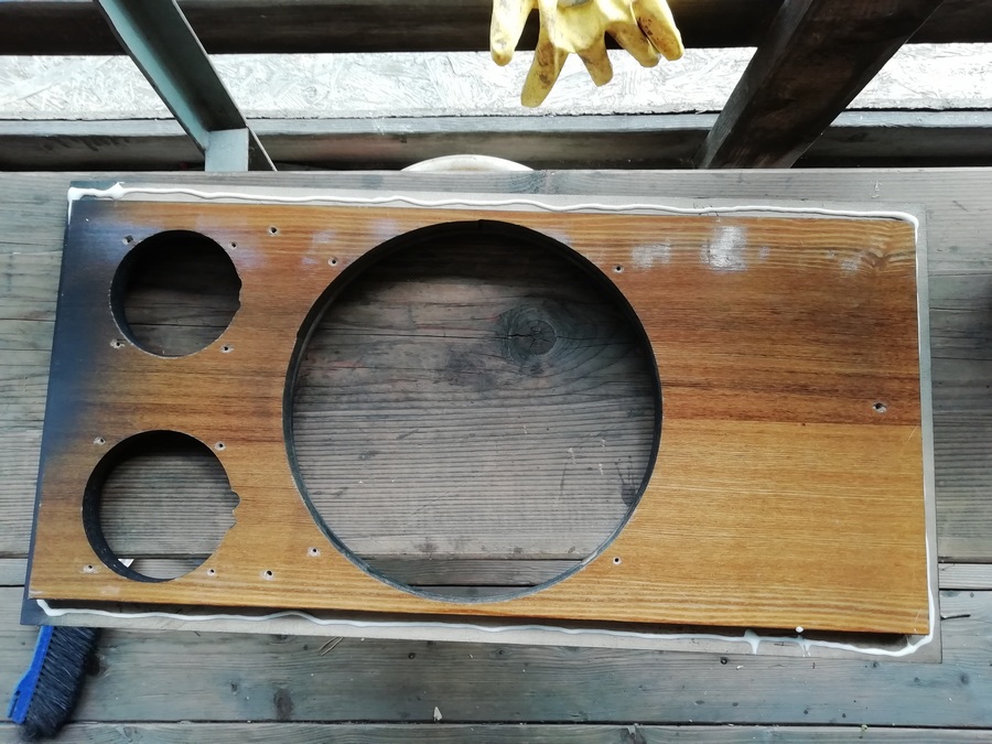 Панель уложил в корпус, даванул на неё всем весом выше пояса и прикрыв плёнкой, положил сверху родную переднюю панель