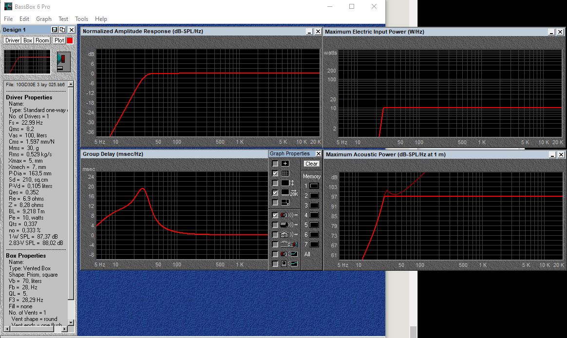Вот, в сообщении прямо над вашим, после намагничивания получилась эл. добротность 0,34. Подставил данные в симулятор с добавкой массы колпака, получил резонанс 23 Гц и эл. добротность 0,35. Уже получше. У модифицированного 10гд-30е линейный ход (+- 4,5 мм совсем по-честному) почти вдвое больше, чем у заводского, так что теперь больше свободы для применения. Посмотрел в басс-боксе, можно и в ЗЯ от тех же 18 литров, можно в ФИ литров на 70. (учтена катушка сопротивлением 0,3 Ом). В нём от 26 Гц выдерживает 10 Вт по ходу диффузора. Не то чтобы я часто громко слушал, но приятно осознавать, что запас есть.
