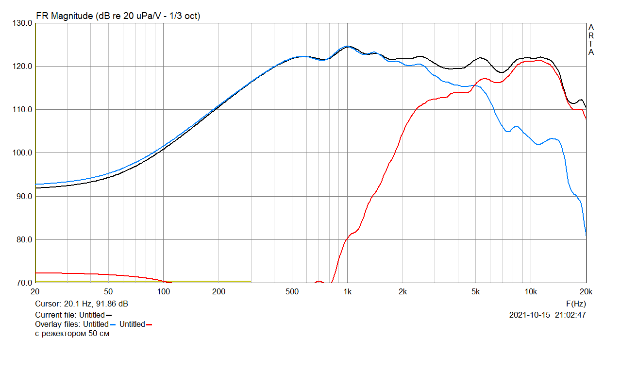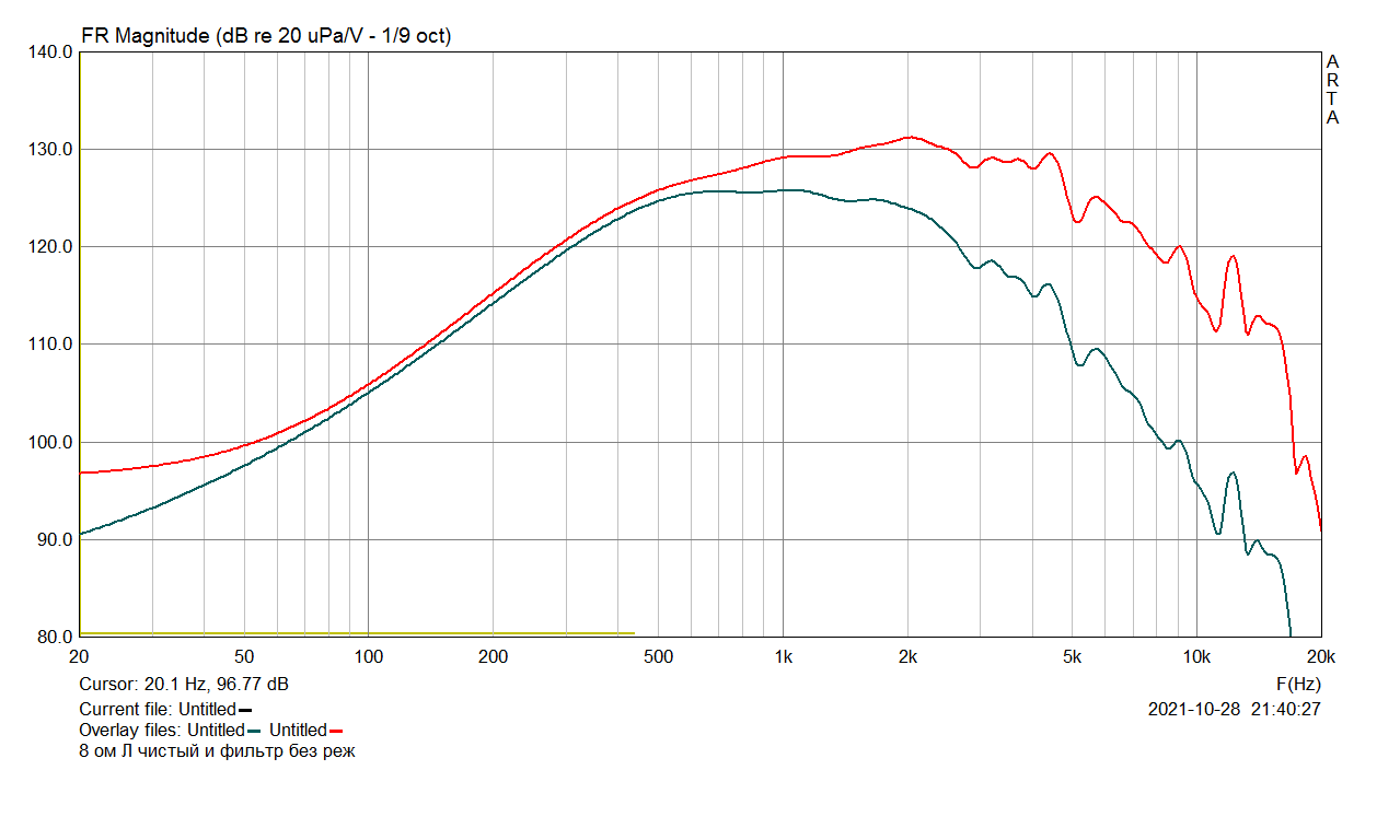 Для сравнения, переставлением макетных колонок (колонки одинаковые), 40 см по оси. Динамик 20ГДС-1л-8, доработанный точно так же, но пшиканный акрилом, тот, который лучше вышел. Разница в чувствительности должна была быть +3дБ в пользу 8-омного (красная кривая):