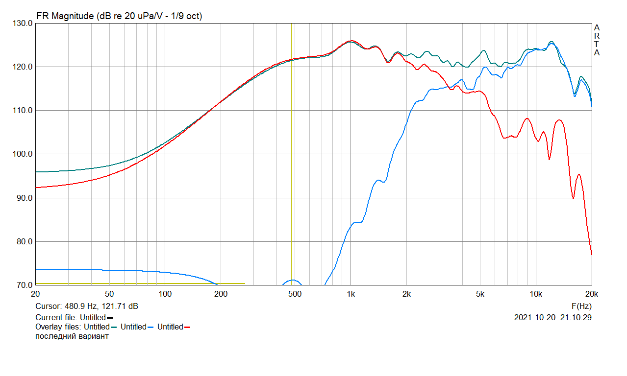 Да! Обнаружил прикольную особенность. Если окном в Арте отсечь ВСЕ отражения, то графики 1/9 и 1/24 октавы - не отличаются! То есть, для исправных динамиков не характерны взбрыки круче 1/9 октавы. В то же время, с бОльшим окном, наблюдается частокол до самых высоких частот. Потому, если нет уверенности в отсечении ВСЕХ отражений, или же если программа не имеет временнОго окна, смотреть с усреднением меньше 1/9 - противопоказано.