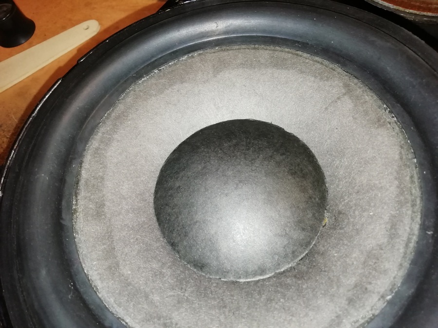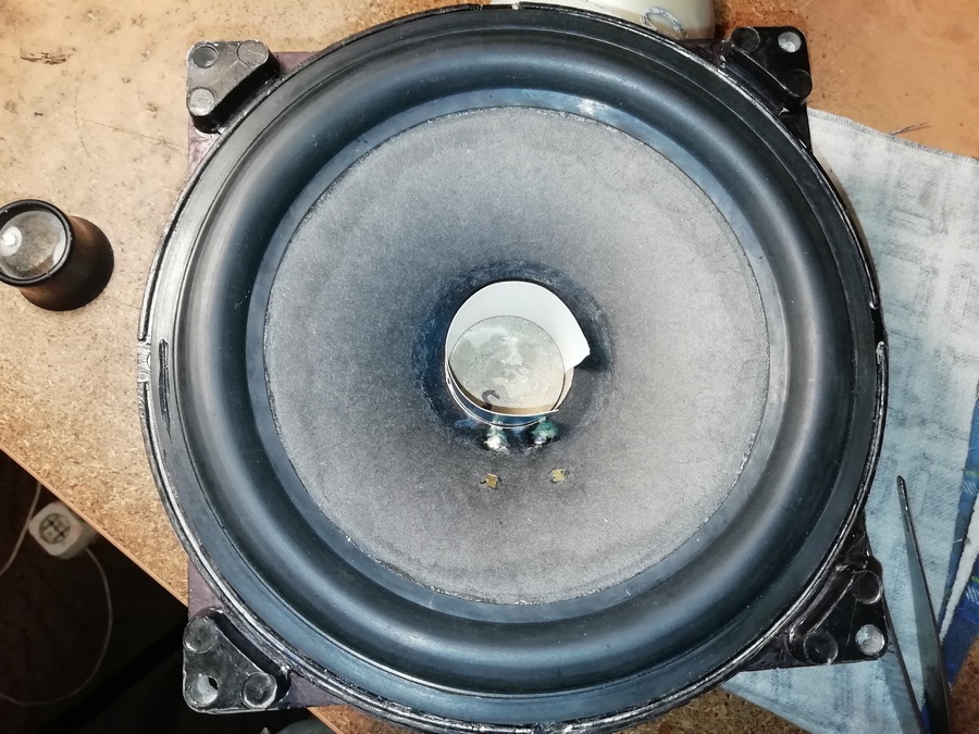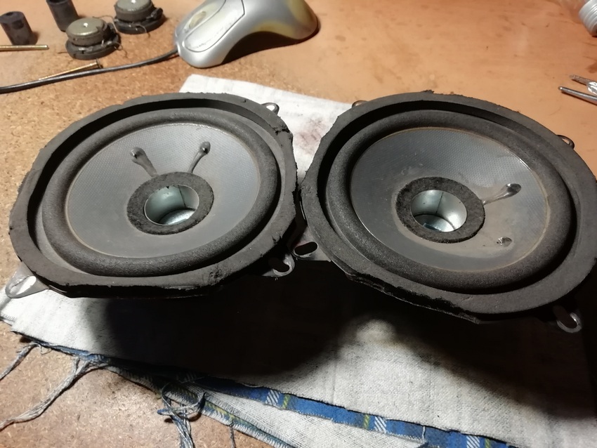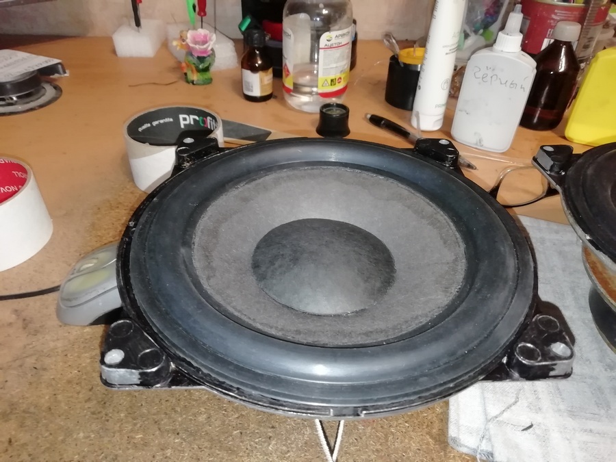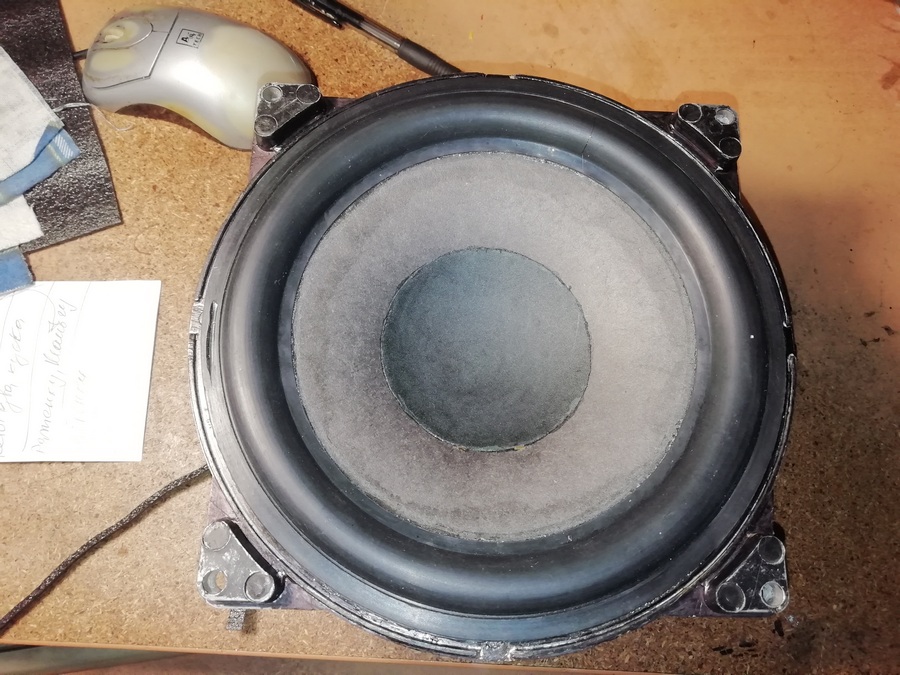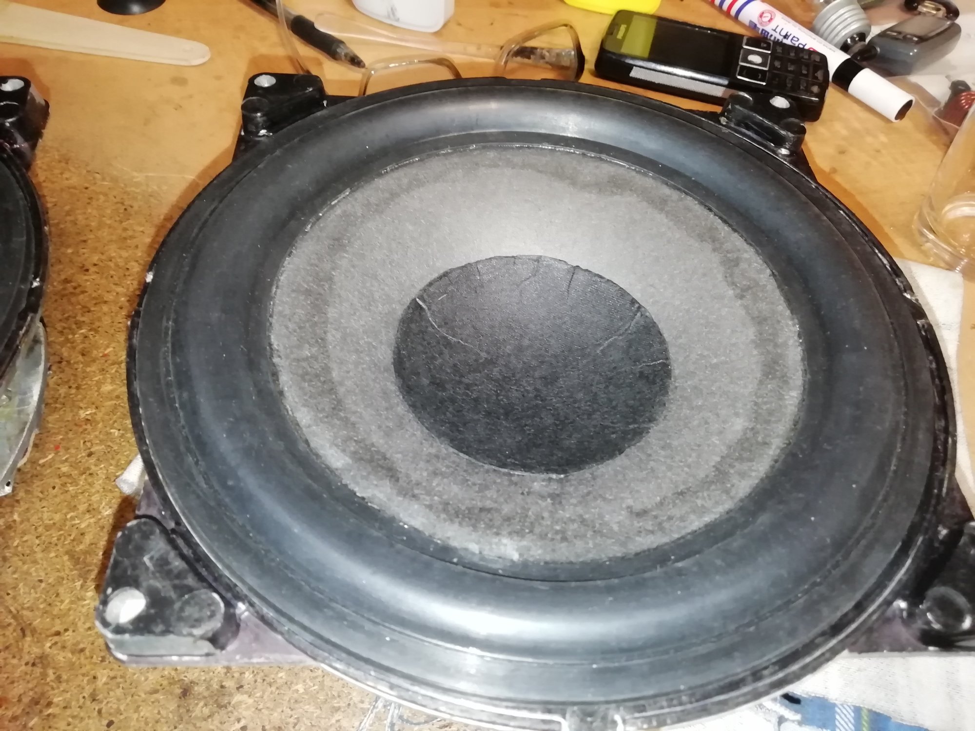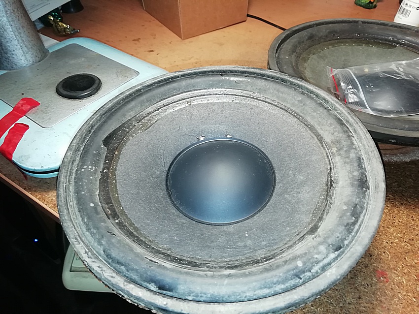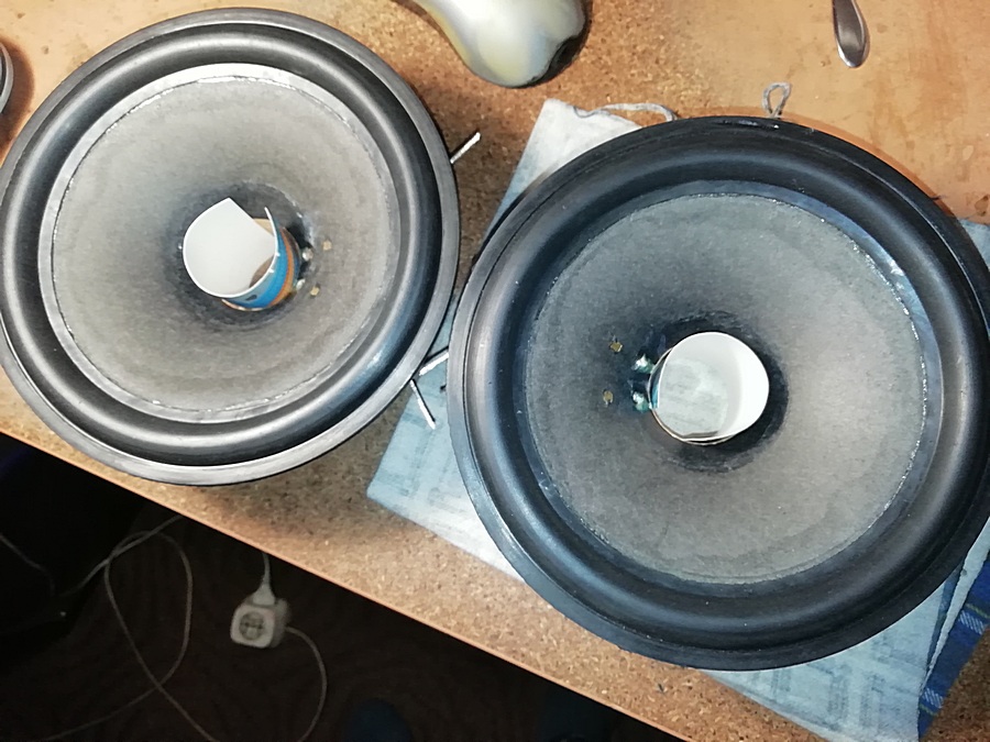 Старые подвесы снял. Многократная и аккуратная пропитка клея у подвеса с обеих его сторон и завёртывание в мягкие пакеты дала результат. Подвесы снялись достаточно легко с минимальными повреждениями диффузоров в виде отсутствия тончайшего, наружного слоя бумаги