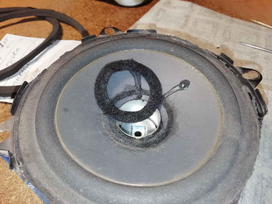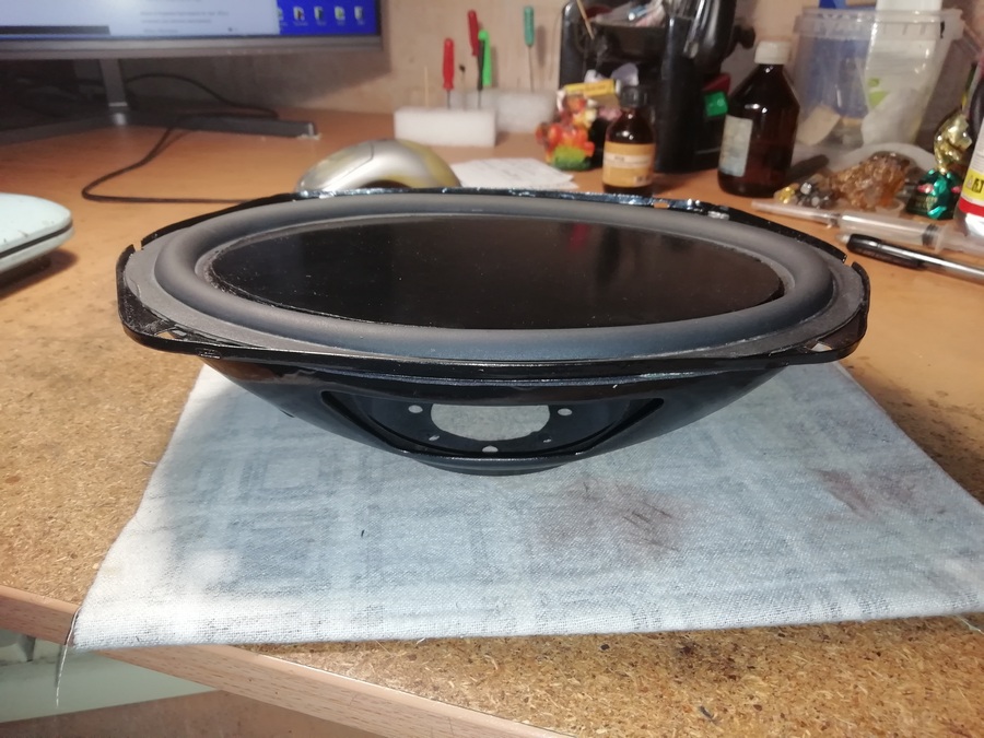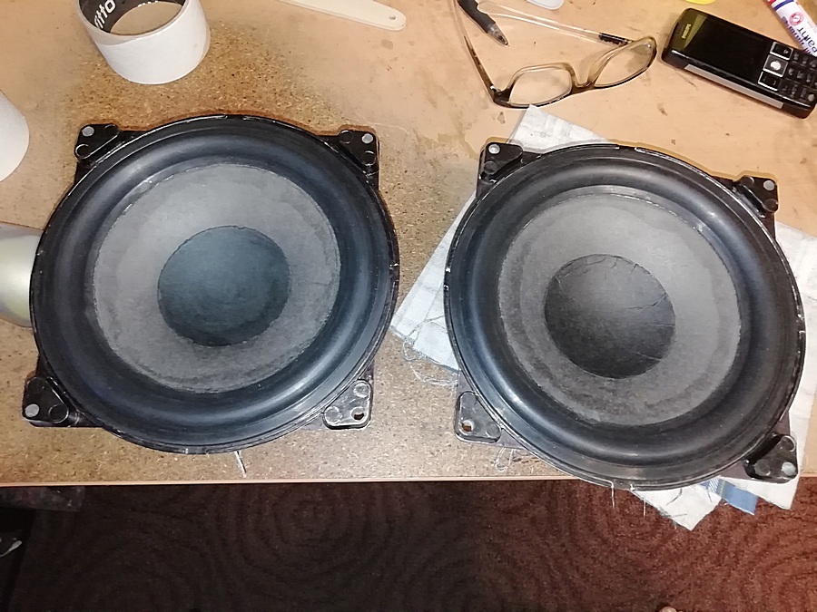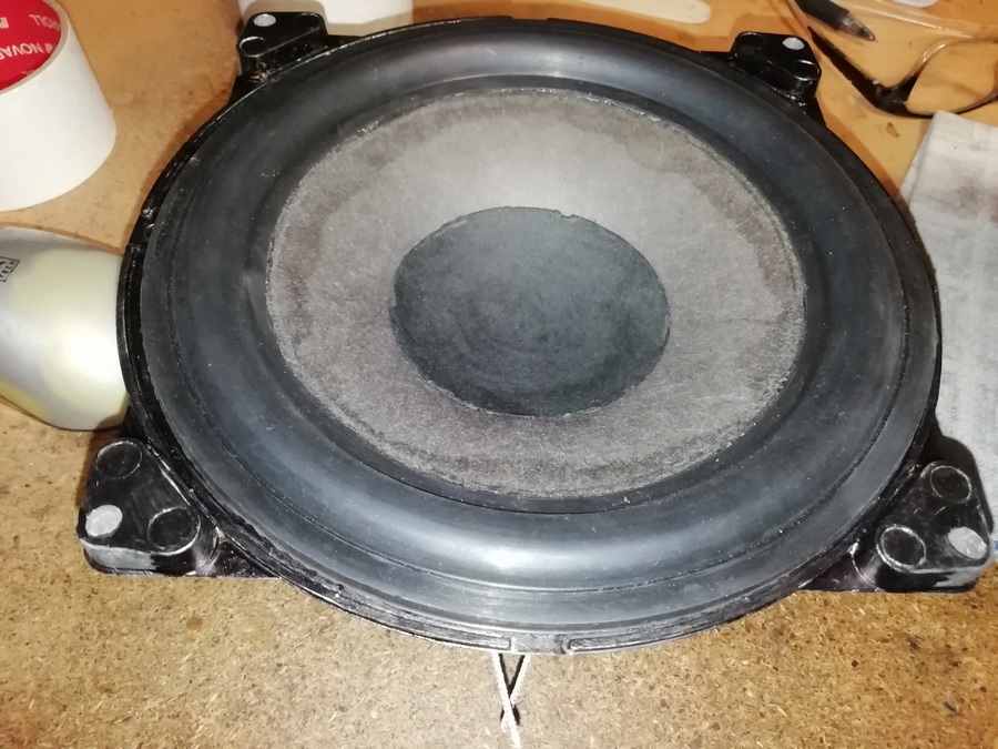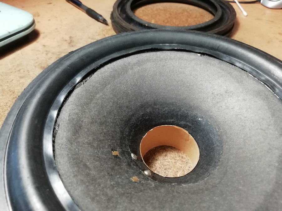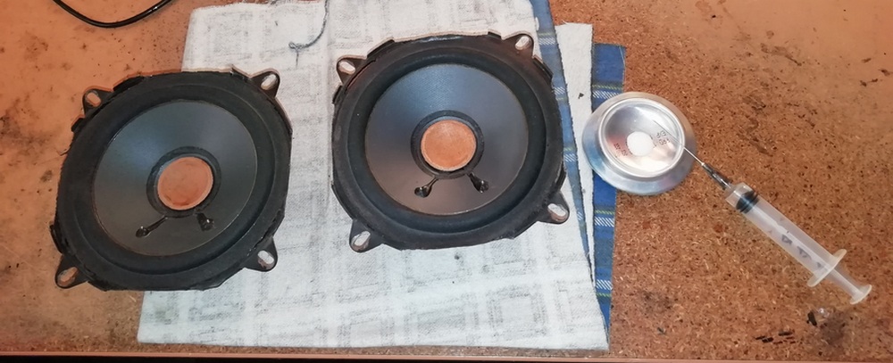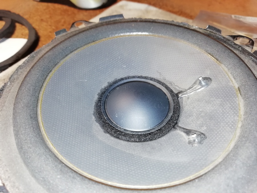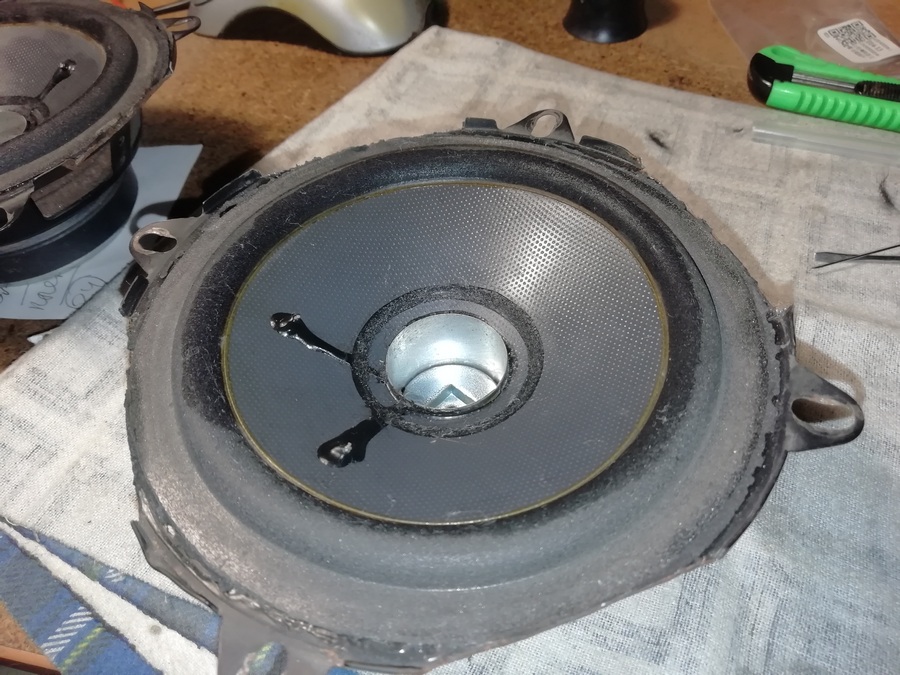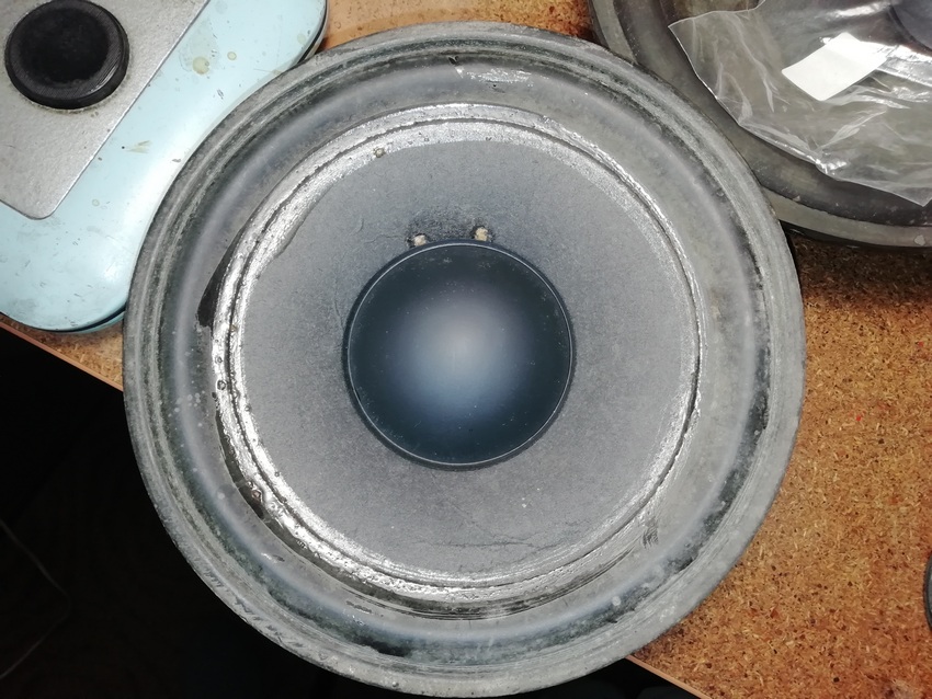 Старые подвесы снял. Многократная и аккуратная пропитка клея у подвеса с обеих его сторон и завёртывание в мягкие пакеты дала результат. Подвесы снялись достаточно легко с минимальными повреждениями диффузоров в виде отсутствия тончайшего, наружного слоя бумаги