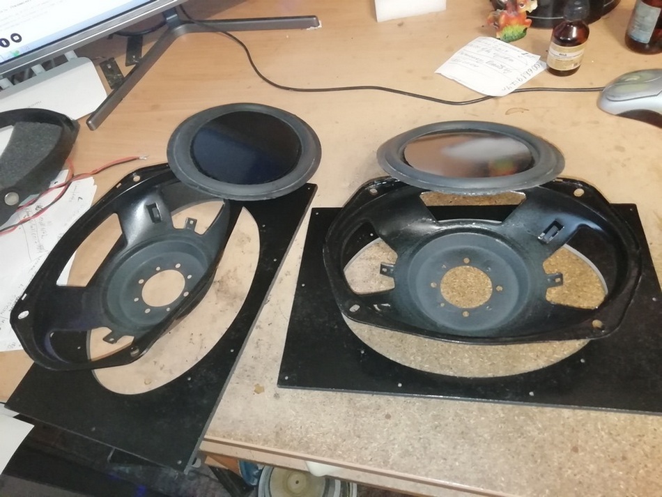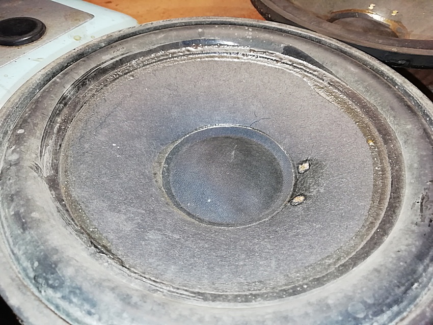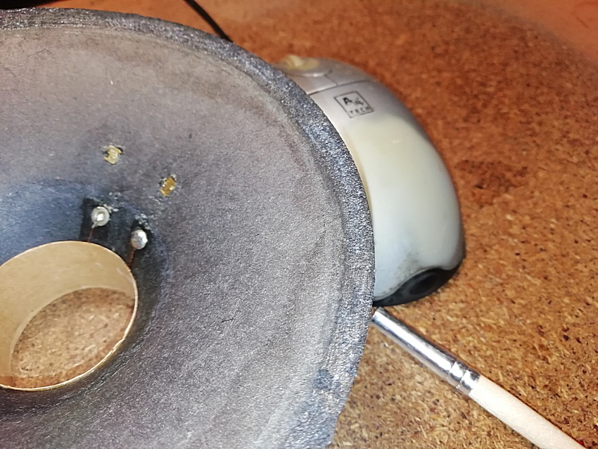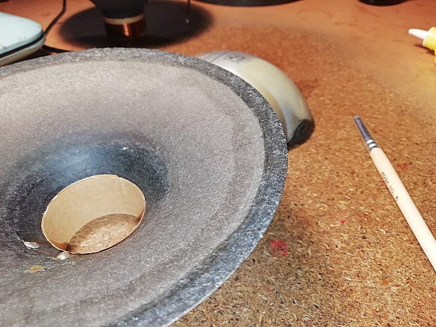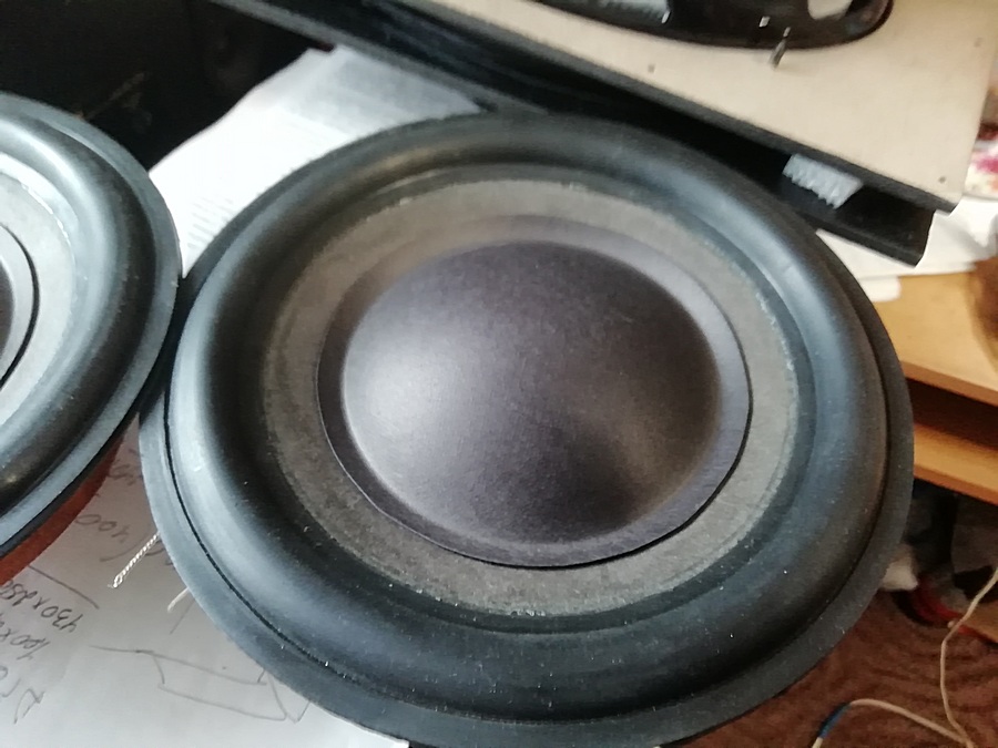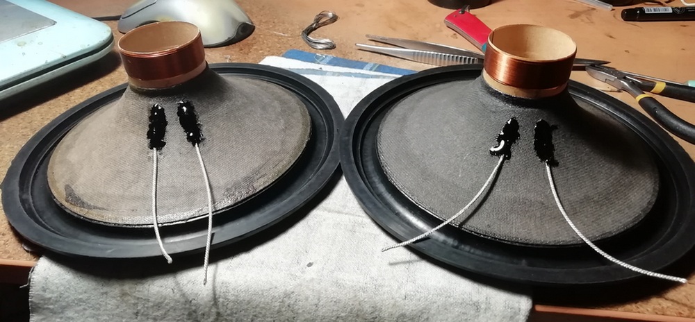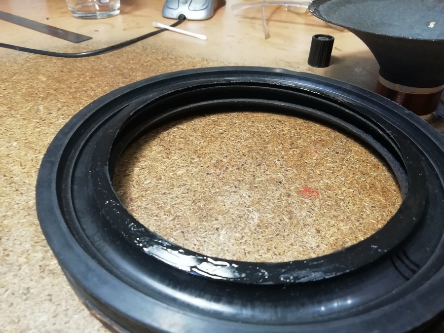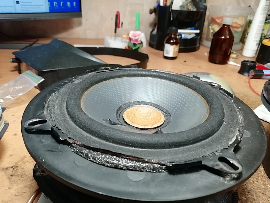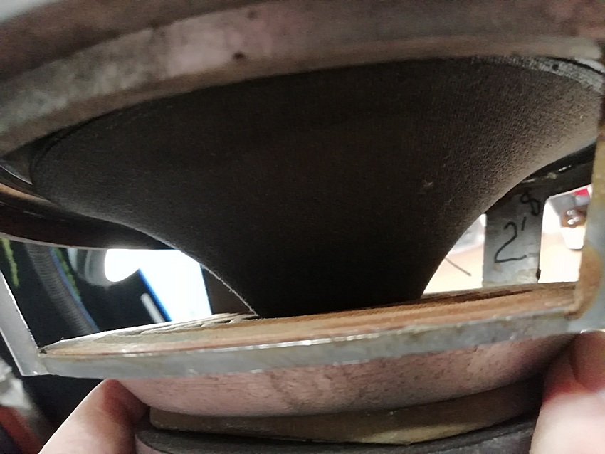 Старые подвесы снял. Многократная и аккуратная пропитка клея у подвеса с обеих его сторон и завёртывание в мягкие пакеты дала результат. Подвесы снялись достаточно легко с минимальными повреждениями диффузоров в виде отсутствия тончайшего, наружного слоя бумаги