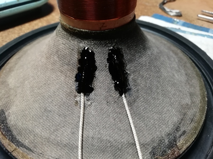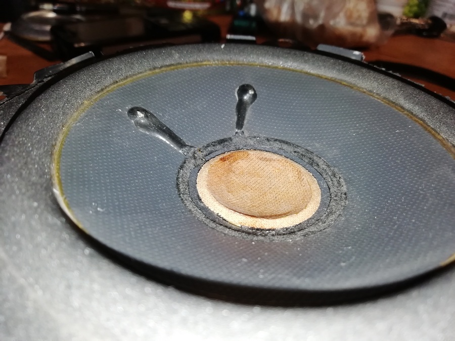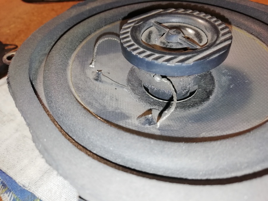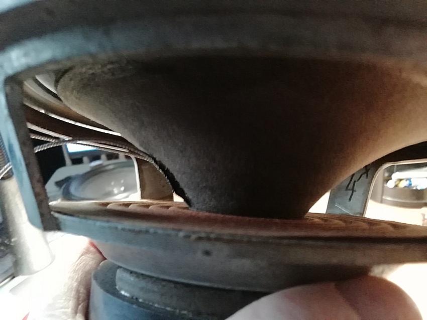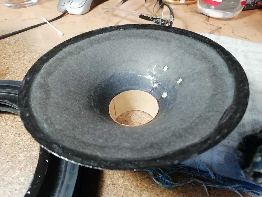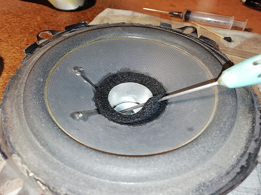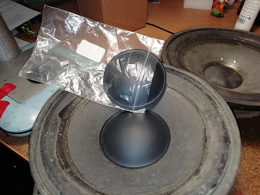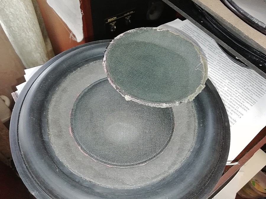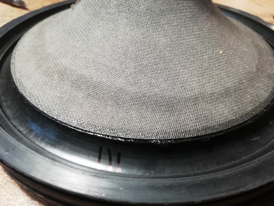 Старые подвесы снял. Многократная и аккуратная пропитка клея у подвеса с обеих его сторон и завёртывание в мягкие пакеты дала результат. Подвесы снялись достаточно легко с минимальными повреждениями диффузоров в виде отсутствия тончайшего, наружного слоя бумаги