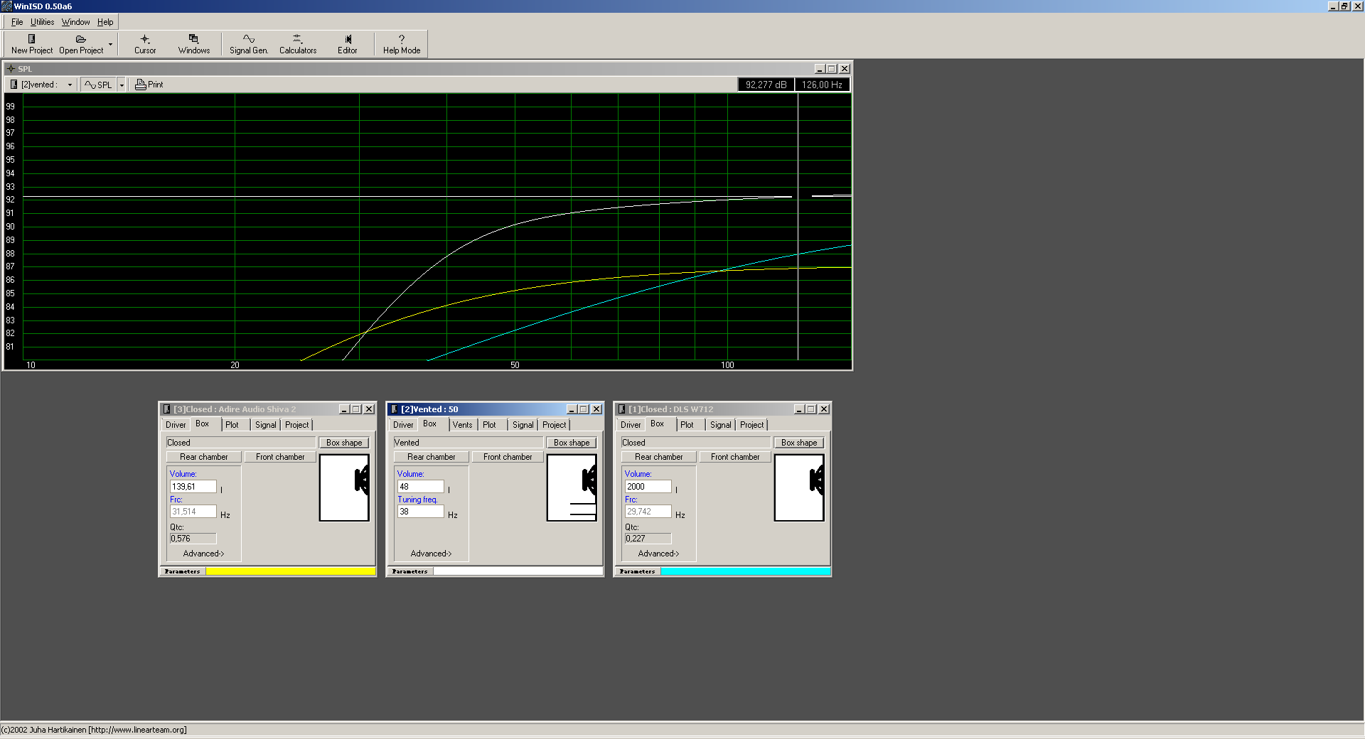 Привел графики смещения подвижки и давления от частоты: желтый ЗЯ при Qc=0,576, салатовый - при Qc=0,227 белый - ФИ. Разница в смещении из-за того, что шива и длс - 12", мой - 10" - и где взлет смещения на резонансе? А у кого КПД и эффективность выше?