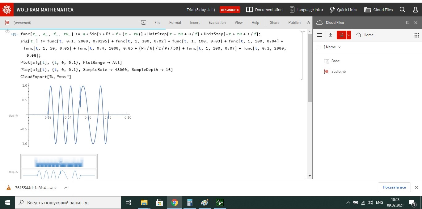 Могу вьіложить wav файл: один период 2кГц, три периода 100 Гц, один период 50 Гц с наложенньім на нем одним периодом 1 кГц, один период 100 Гц и один период 2 кГц (если не ошибся по тексту)