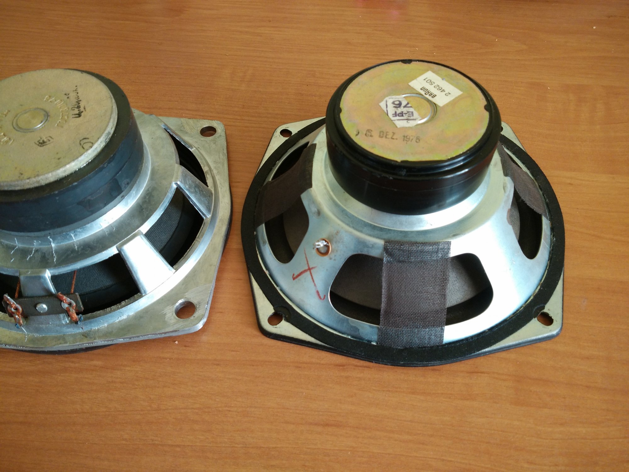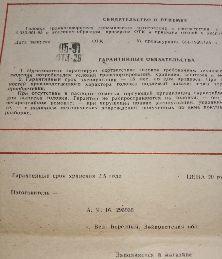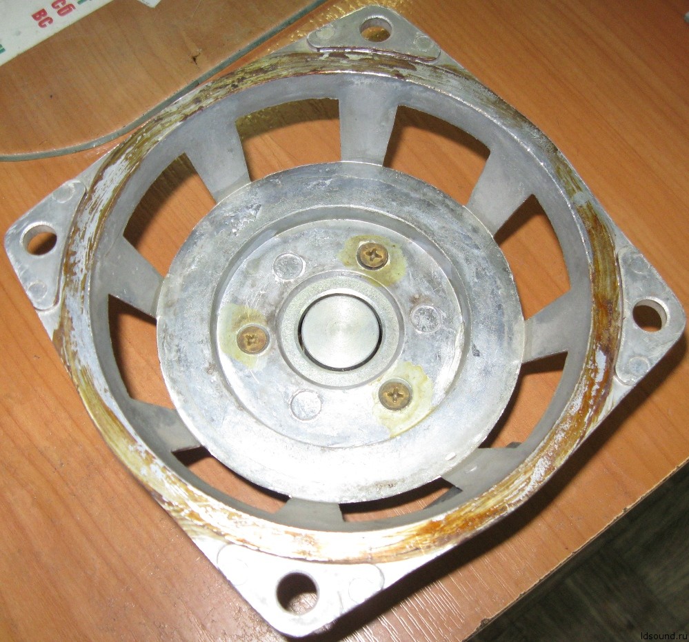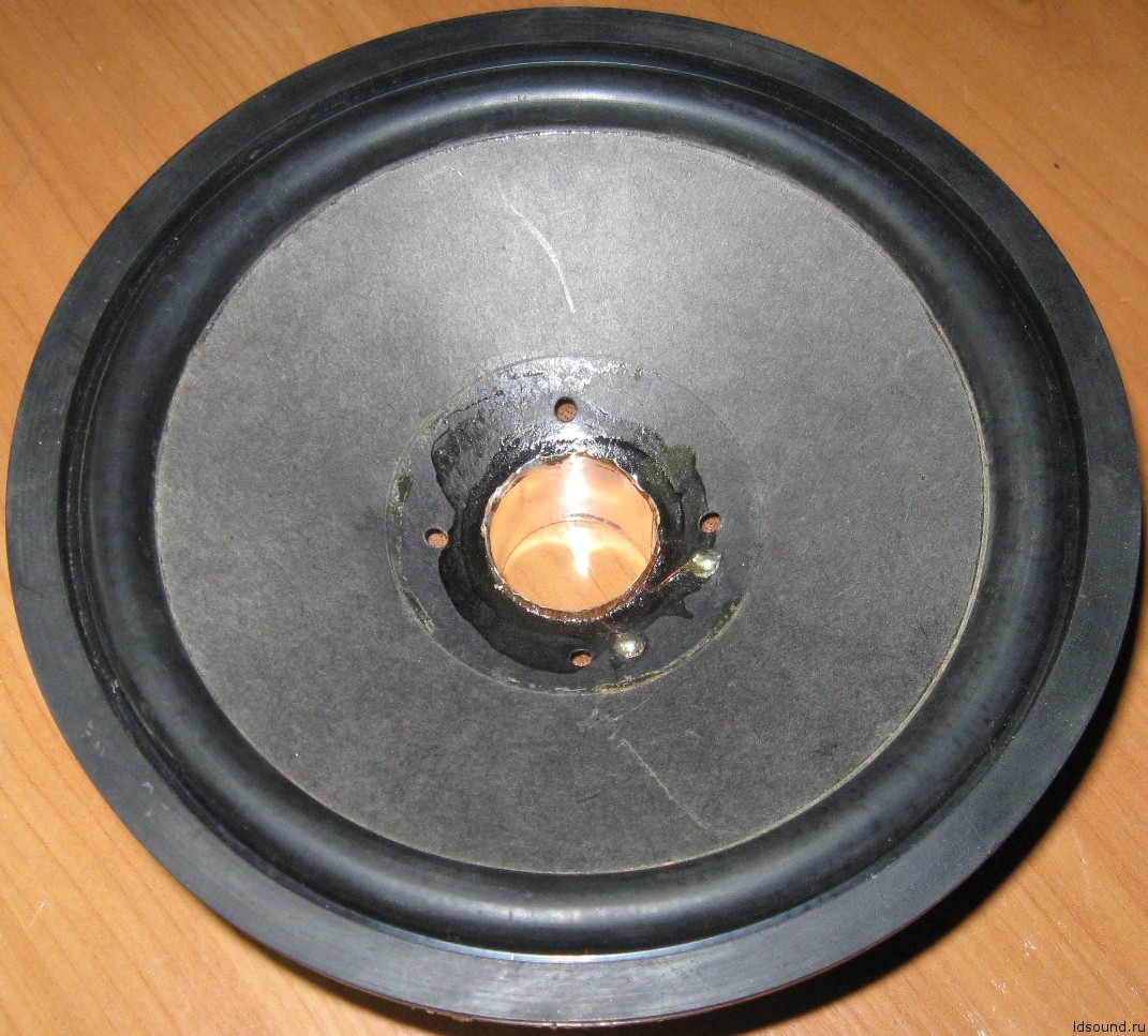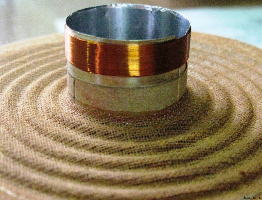 - Звуковая катушка намотана медным проводом диаметром 0,18 мм на алюминиевом каркасе высотой 27 мм. намотка двухслойная, в первом слое 31 витков, во втором – 30, омическое сопротивление 3,8 ±0,2 Ом. Высота ЗК 7,5 мм, внутренний диаметр 25,4 мм, внешний (вместе с намоткой) 26,6 мм. На верхний край звуковой катушки наклеено резиновое кольцо весом 1,6 гр.