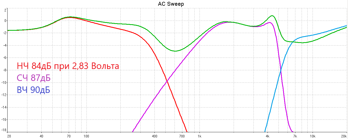 Как видите, для получения АЧХ, как у Виталия, требуются очень интересные чувствительности линейки динамиков, не совпадающие у СЧ на -3дБ, а у НЧ на -6дБ относительно даташита!