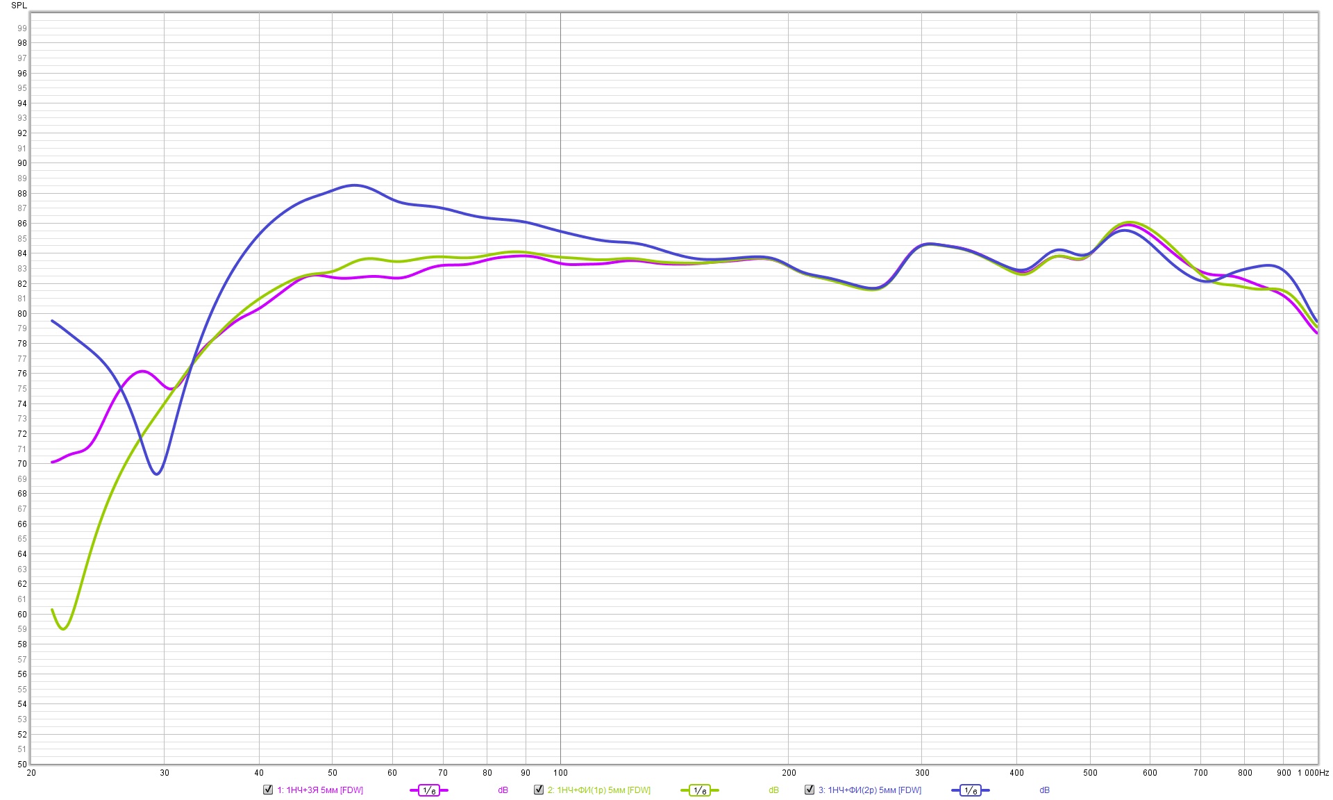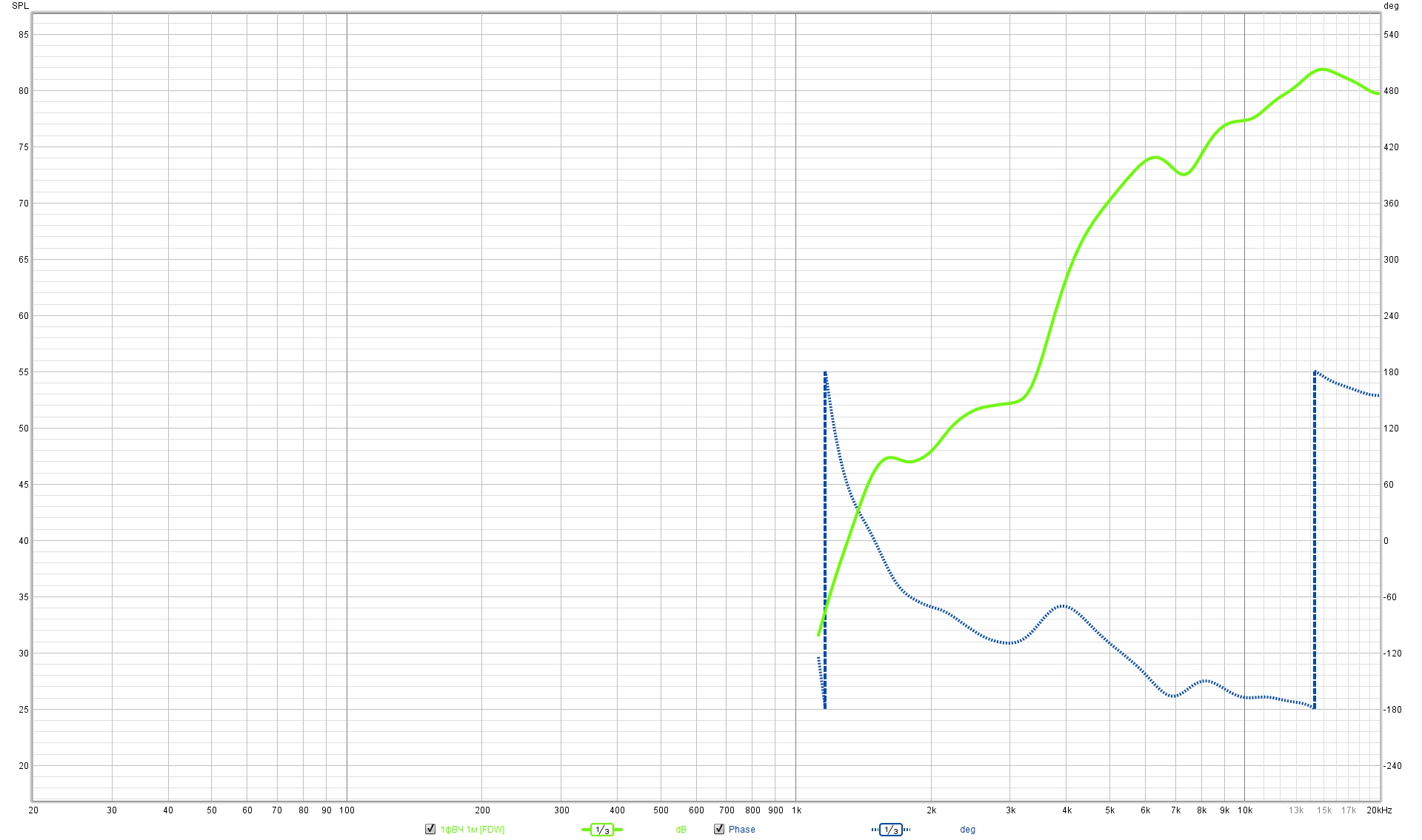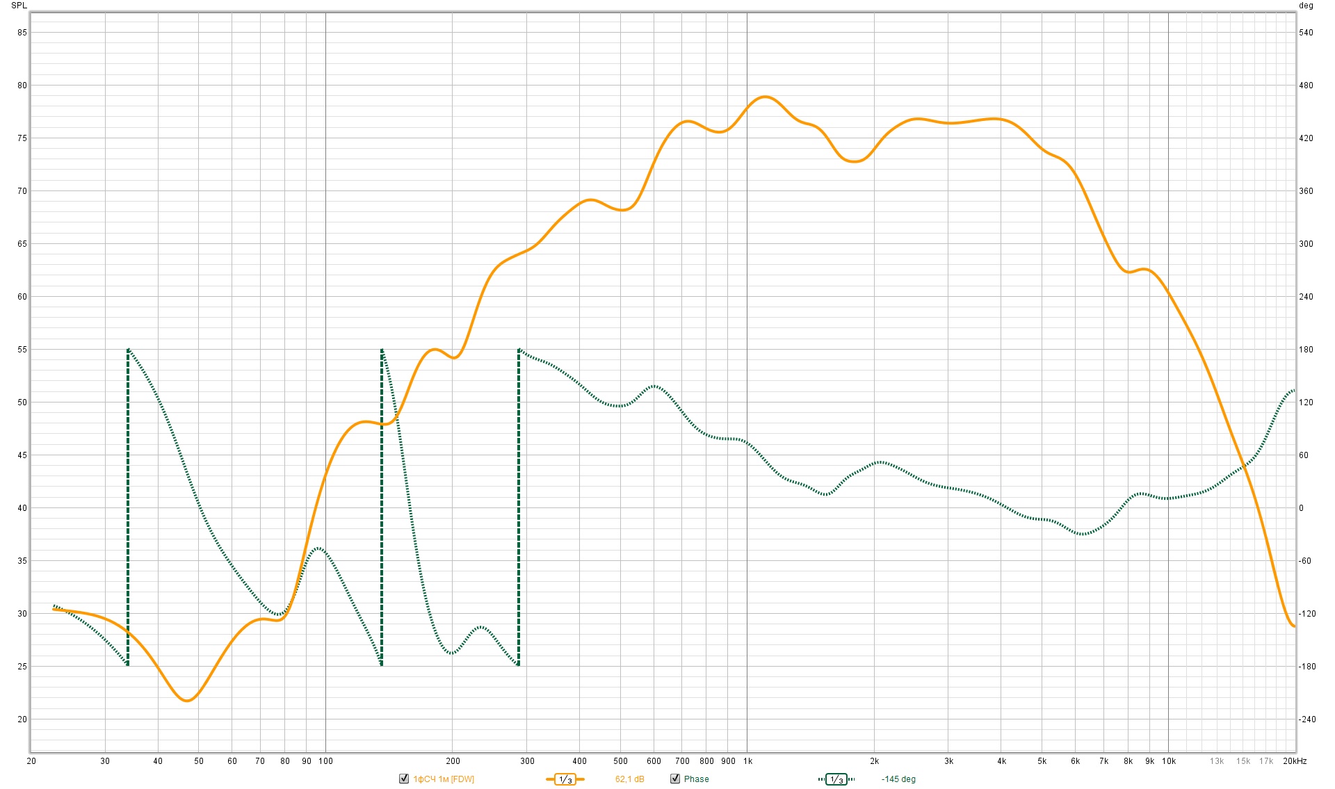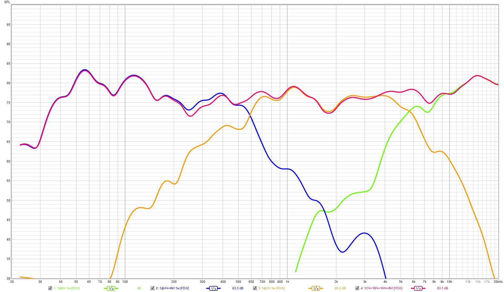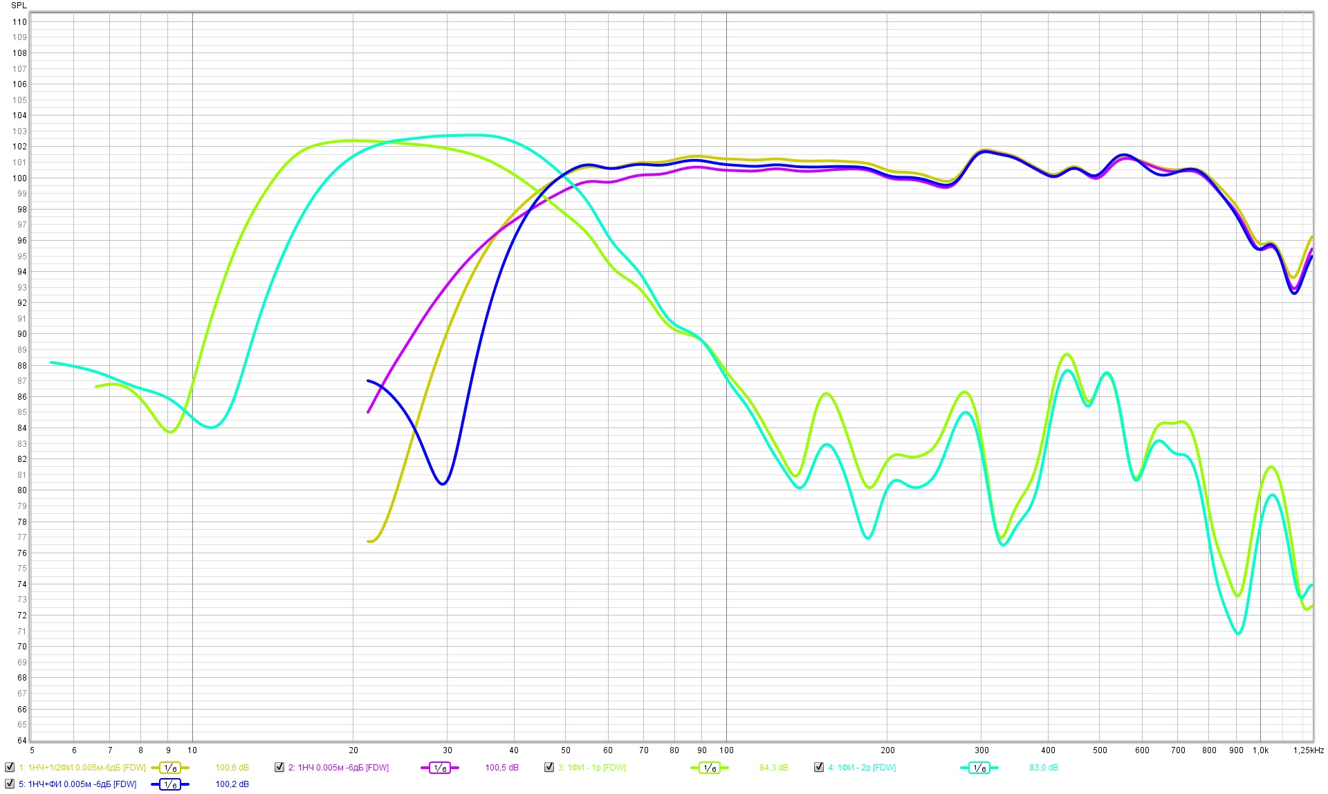Области механических резонансов динамиков не попадают в зоны совместной работы, и я не корректировал ФЧХ по звуковому давлению возле резонансов.