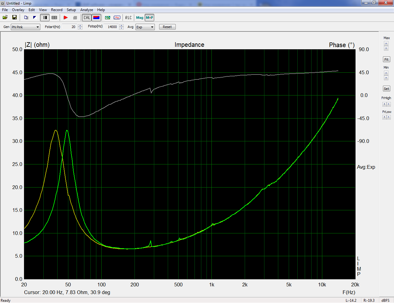 А ещё эта прекрасная звуковуха что-то на 14900 делает странное - на АЧХ ВЧ там перепад ФЧХ виден, а тут на ИЧХ аж какой-то провал в Re происходит... поэтому ограничил сверху диапазон, чтобы не мешало измерениям: