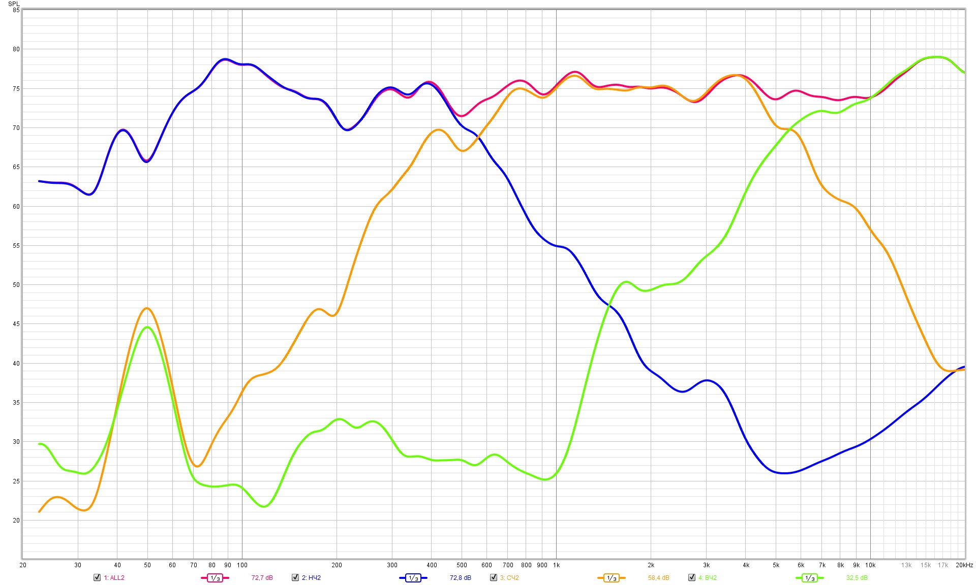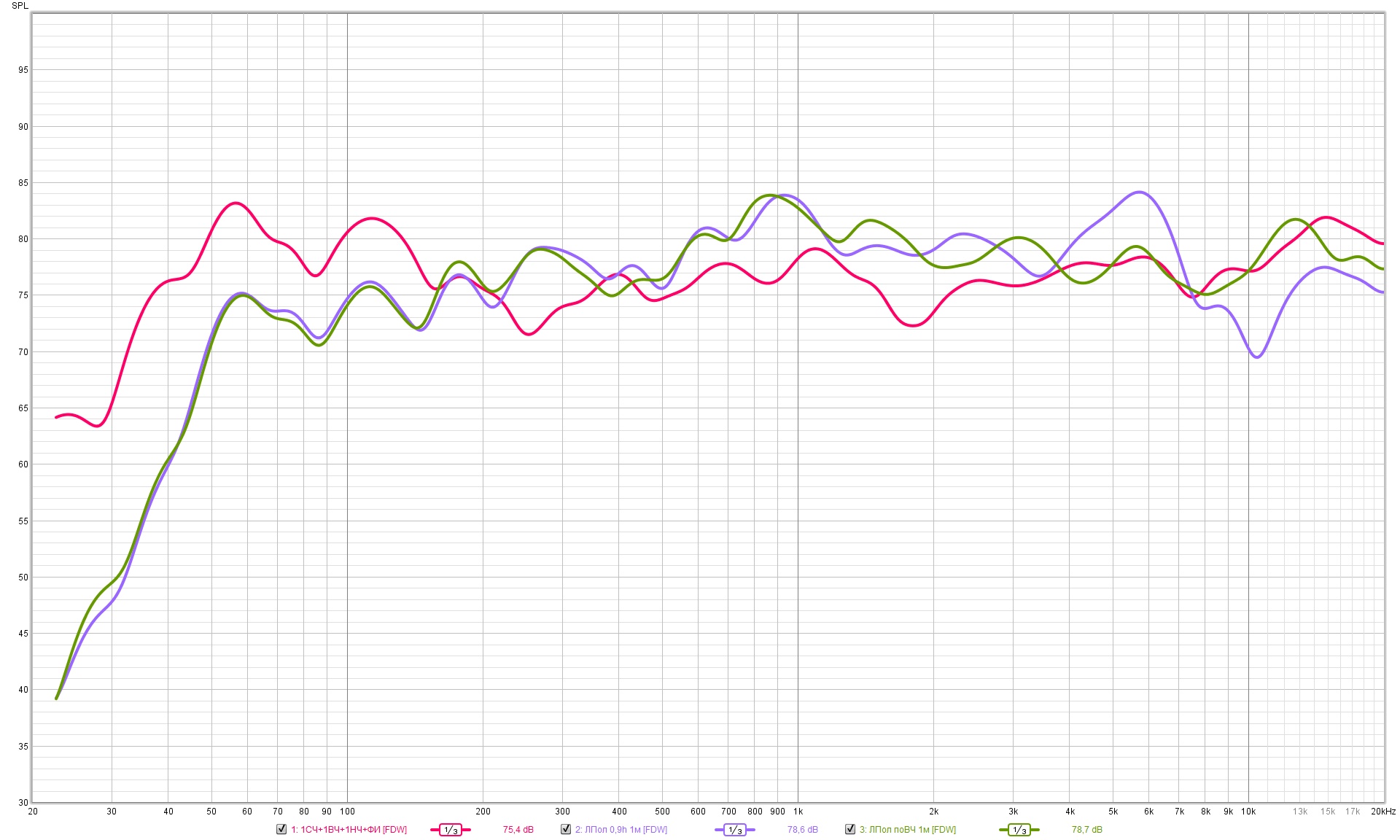 Раз повёл повествование про ушное сравнение, то решил же глянуть, что же там у меня такое с полочниками, звучание которых меня на середине больше устраивало, чем этой 3х полоски. Для этого возвертаемся на неделю назад, всё в той же точке пространства по среди комнаты вместо 90 литрового ящика из отходов древесной промышенности ставится недозаготовка тыловой акустики с 15+ летним стажем и фильтром 0+1. Сначала сделал замер всё с того же положения микрофона, что и для 3х полоски было... ну протупил, не поднял, а потом по уровню ВЧ.